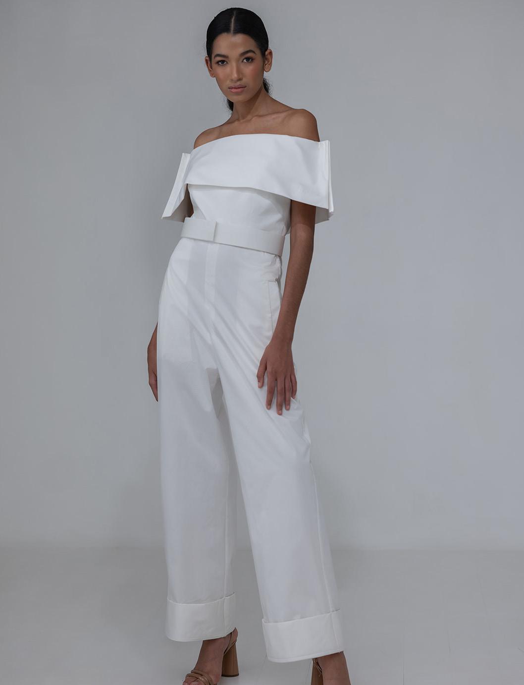 es un jumpsuit largo off-shoulder en algodón, con pieza sesgada como una capelina, bolsillos vivos, cierre trasero y cinturón.