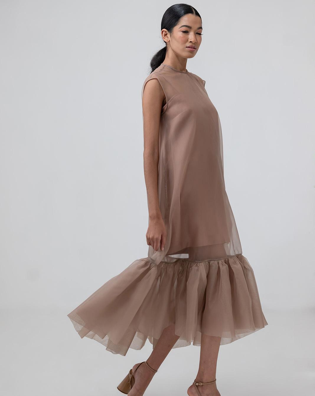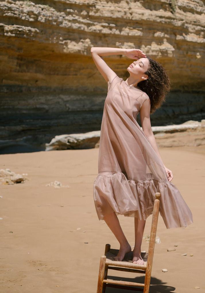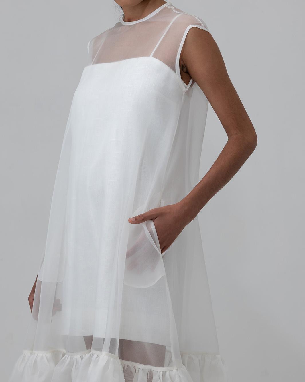 es un vestido tunica con tiros, debajo de un vestido largo recto sin mangas en organza seda; falda arruchada con bolsillos y cierre trasero.
