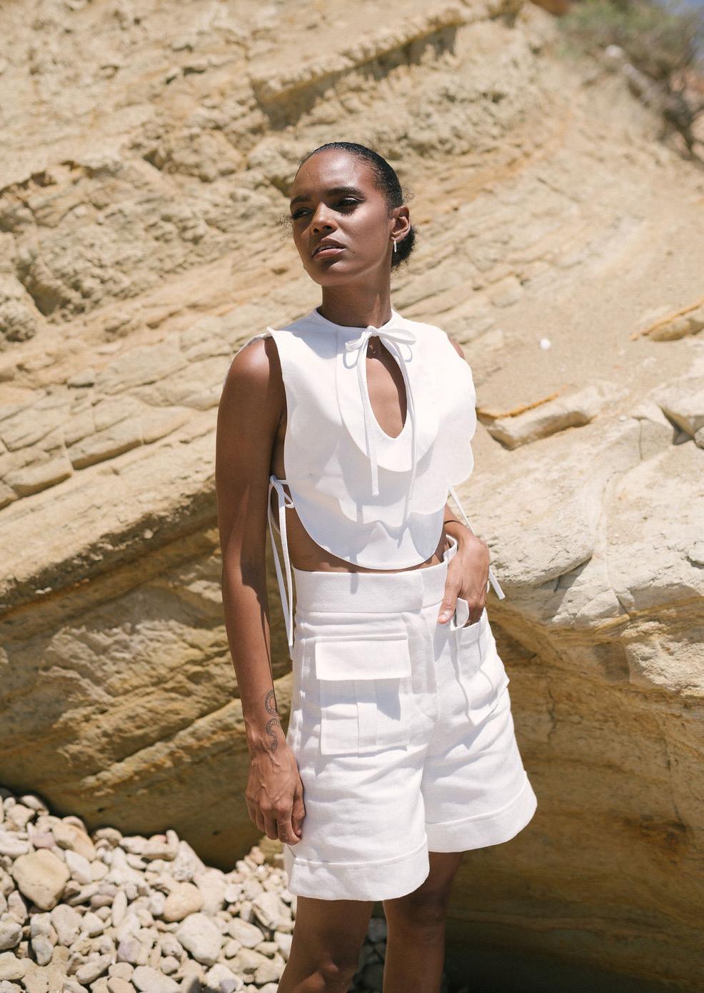 es un croptop sin mangas de escote V, con doble pechera circular y abotonadura delantera. 100% Algodón Pique US$305.00