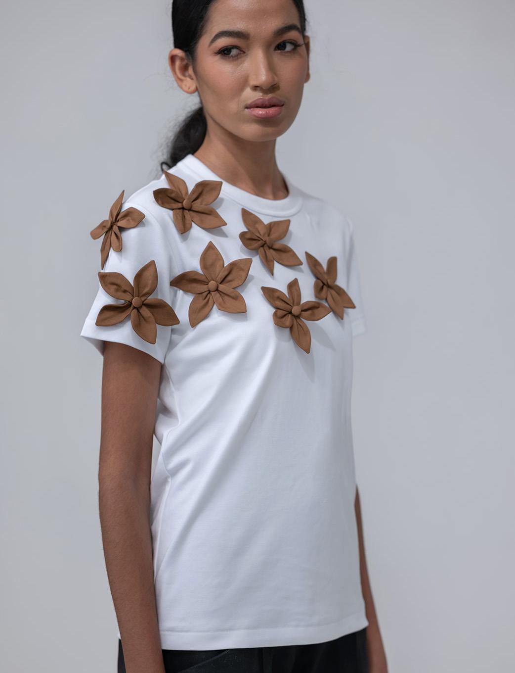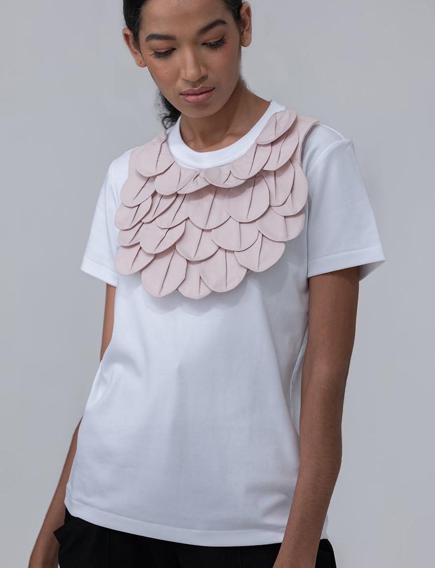 es un t-shirt con applique arruchado alrededor del cuello. 100% Algodón