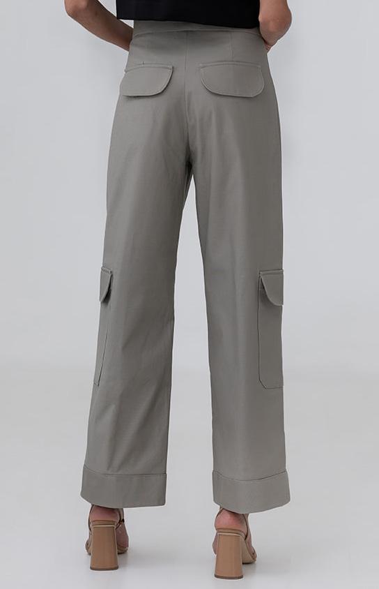 es un pantalón cargo con costuras decorativas y cierre delantero.