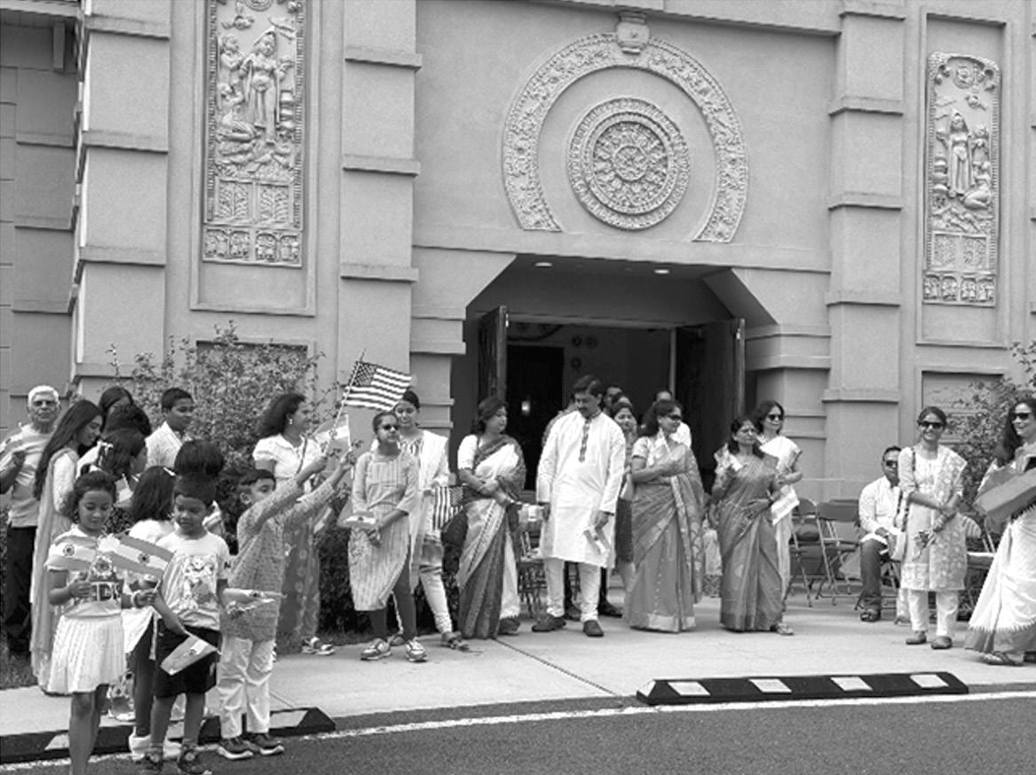 On Friday, August 15, Ananda Mandir celebrated its annual Heritage Day with a vibrant display of patriotism, culture and community spirit. The morning began with a lively procession, as the crowd chanted, “Vande Mataram,” led by our priest,Bishwabhai. Upon reaching the flagpole, we paused to honor the sacrifices of those who gave their lives for India’s freedom. The flag hoisting ceremony was followed by solemn singing of“Jana Gana Mana,” accompanied instrumentally by Soujattyo and led vocally by Shreya, with everyone joining in. Afterward, Anaya performed the American national anthem and Aishik sang, “Vande Mataram,”. Dr. Dipak Sarkar then delivered an inspiring speech reflecting on the values of unity and resilience.