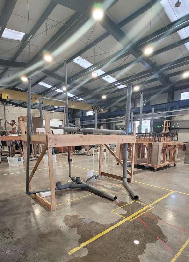 A través de un ejemplo, empezamos colocando los aparatos que se ubicaban debajo del soporte de madera, como: la salida de desagüe del inodoro y lavatorio Luego, se insertaron los tubos de ventilación.