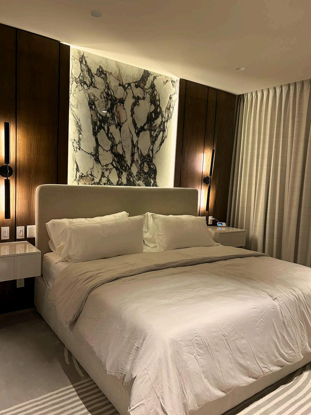 The design was inspired by eclectic style, creating a design where all materials flow from one space to another, generating an architecture that is light, tropical, and contemporary The choice was made to use almond-toned oak wood and Crema Marfil marble, the color palette and indirect lighting create a sober and cozy environment We used decorative accents in warm tones, natural fibers like linen and sisal jute that enhance the monochromatic interior.