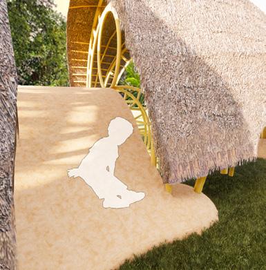 Combining the known use of bamboo in balafons and wind chimes, a possibility of exchange of the hanging bamboos was proposed, allowing the child to create their own melodic sequence, that can be played by children or by the wind, leaving their mark in the space. The other “notes” can be kept in a niche built into the base. The shell-shaped coverage also boosts the
