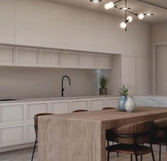 Además, la cocina cuenta con una despensa incorporada para almacenar alimentos no perecederos y otros suministros. La distribución de los muebles está pensada para facilitar el flujo de trabajo en la cocina, con una disposición estratégica que optimiza el espacio y mejora la funcionalidad.