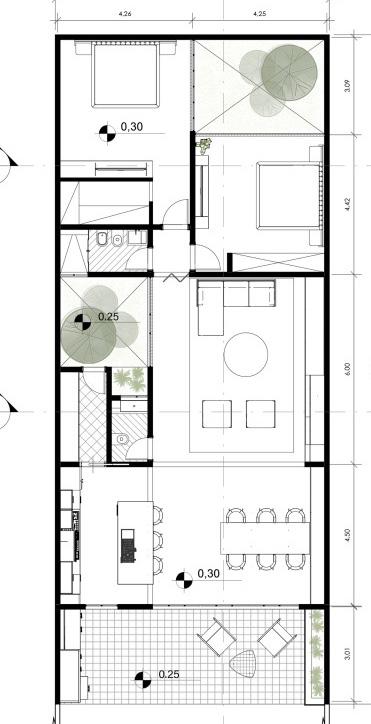 Diseño Integrado: Desarrollamos un diseño integral que optimiza el espacio en un terreno angosto, maximizando la funcionalidad y el confort tanto en el quincho como en la casa.