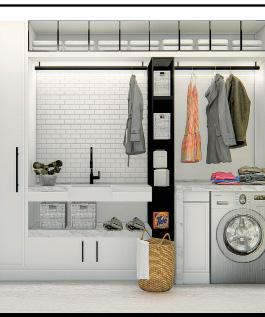 Cuenta con un completo conjunto de muebles de lavandería que incluye un lavabo, espacio de almacenamiento para productos de limpieza, así como una zona de trabajo para lavado a mano.