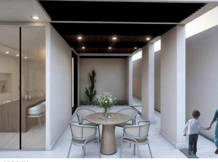 La planta baja de la vivienda ofrece una distribución funcional y fluida que maximiza el confort y la comodidad de sus habitantes. Al ingresar, nos recibe un amplio espacio de recibimiento que da la bienvenida con calidez y amplitud. Este espacio se conecta con un patio interior, que actúa como el corazón de la casa, proporcionando luz natural y ventilación a los distintos ambientes y sirviendo como punto de encuentro junto a la escalera que articula ambos niveles. A un lado del patio se encuentra el área de cocina, que integra el lavadero y un depósito adicional, ofreciendo una zona completa para las tareas domésticas, mientras que en el otro lado del patio se sitúa el área social de living estar, diseñada para relacion y entretenimiento.