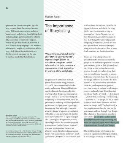 in all of them, the one that can make the biggest difference, and that is the story. Stories have been around as long as language has existed. We can even say that stories are necessary to humans, to feed their hunger for experiencing and imagining. Nevertheless, stories are also very personal and intimate; through a story we reveal information that, at some level, means we are sharing ourselves. Stories are of great importance to presentations for two reasons: first, the people in the audience experience a creative process taking place in their presence and they begin to be a part of that creative process. Second, storytellers bring their own personality and character to a story. In the case of architecture, the character of the design is the one that forms the story. In most of the presentations by students, there is a good organization; general overview, research, analysis, result, design concept and renderings. Then they start reporting: ‘I did . . .’, ‘I think . . .’, ‘I designed . . .’, rather than presenting: ‘The building’, ‘The house’ or ‘The design’. To me, it seems to be too much about them and too little about the design itself. The harsh truth is that people are not there for you, but for your design and you through your design. The solution to this common mistake is very simple: do not give a lecture about your experience of doing something, but about the experience you would like to give to your audience through your design. The first thing to do is to break up the common organization of the presentation. It is no longer necessary to introduce a