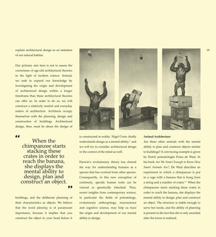 explain architectural design as an imitation of our natural habitat. Our primary aim here is not to assess the correctness of age-old architectural theories in the light of modern science. Instead, we seek to expand our knowledge by investigating the origin and development of architectural design within a longer timeframe than these architectural theories can offer us. In order to do so, we will construct a relatively neutral and everyday notion of architecture. Architects occupy themselves with the planning, design and construction of buildings. Architectural design, then, must be about the design of