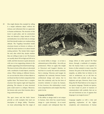 One might dismiss this example by calling it a simple utilitarian object, without the richness and refinement that we appreciate in human architecture. The structure of this tower is quite plain, and its construction does not demand a large amount of time and dedication. Let us then look at a strange bird that should weaken our condescending attitude. The Vogelkop bowerbird builds structures known as bowers or arbours, of which the main function is to attract female mating partners. The female birds inspect the nest, after which they decide whether they are willing to mate or not. The bowers