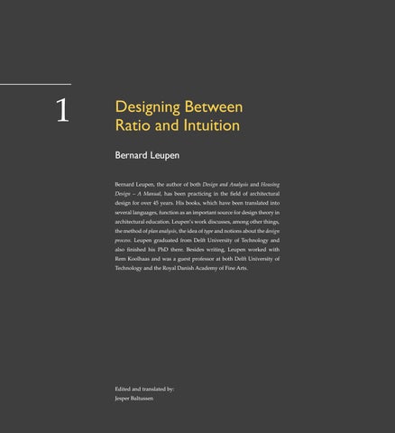 Designing Between Ratio and Intuition Bernard Leupen Bernard Leupen, the author of both Design and Analysis and Housing Design – A Manual, has been practicing in the field of architectural design for over 45 years. His books, which have been translated into several languages, function as an important source for design theory in architectural education. Leupen’s work discusses, among other things, the method of plan analysis, the idea of type and notions about the design process. Leupen graduated from Delft University of Technology and also finished his PhD there. Besides writing, Leupen worked with Rem Koolhaas and was a guest professor at both Delft University of Technology and the Royal Danish Academy of Fine Arts.
