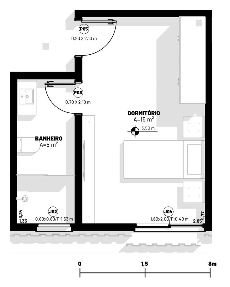25 Dormitórios + Banheiro 15m² 5 Dormitórios Adaptados + Banheiro 25m² Cama Solteiro, Guarda Roupa, Mesa de cabeceira e Tv