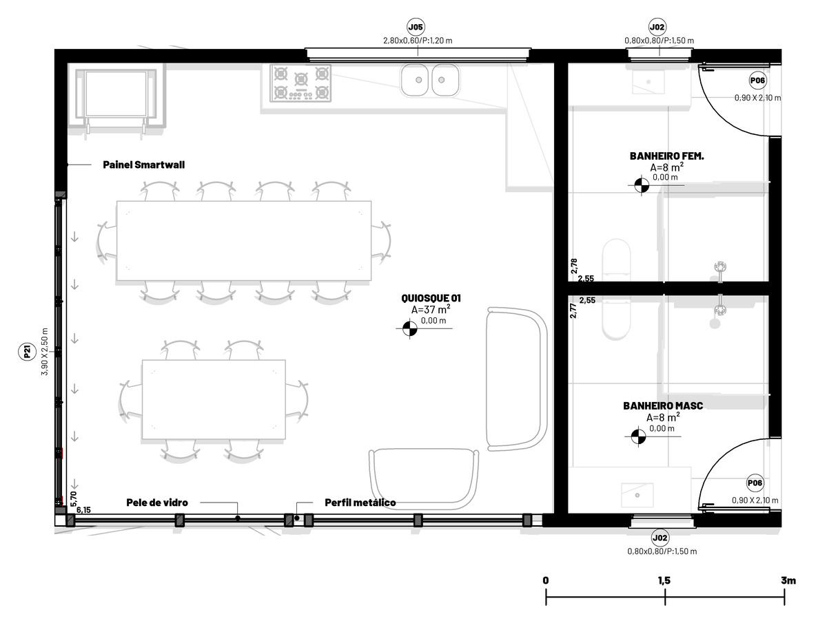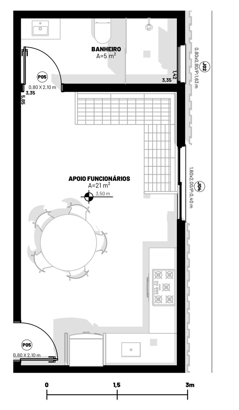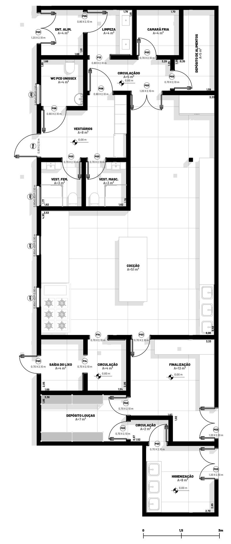 Cozinha; Recebimento e pias para limpeza de alimentos, Câmera Fria, Depósito de Alimentos, Depósito de Louças, Bancada de preparo, Pias, Fogão Industrial, Torre Quente, Retorno e Pias para limpeza , Saída de lixos e Vestiários Restaurante: Buffet, Copa e Caixa