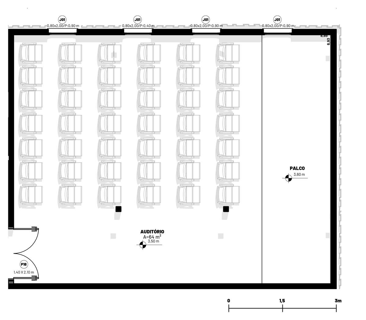 Sala de Aula Mesas escolares, Quadro e Retroprojetor 15 pessoas Recomendado 4 40 160 Auditório 200 Palco, Assentos padrões, Sistema de som e imagem 200 pessoas Obrigatório 1 210 210