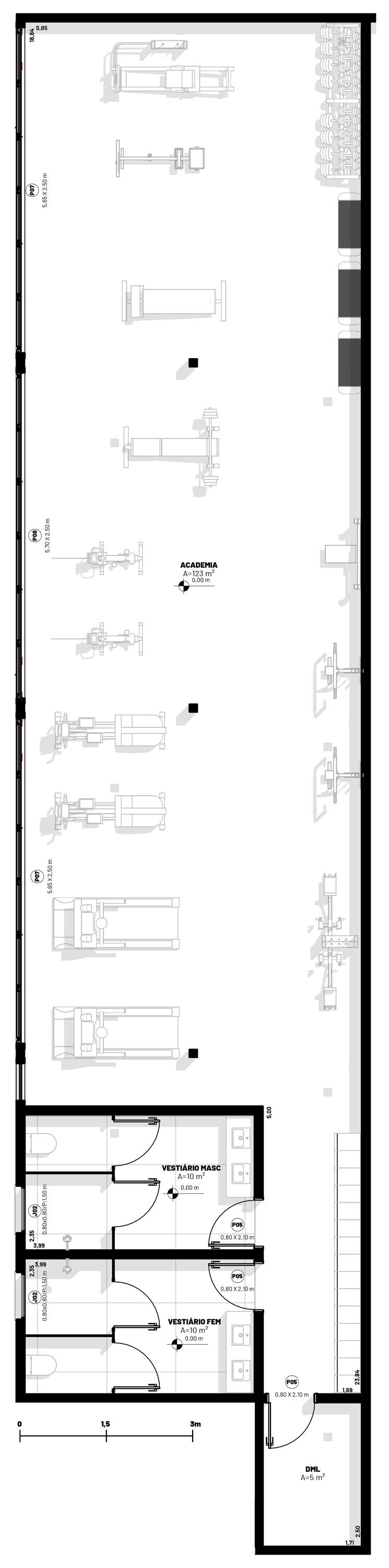 Vestiários: Chuveiros, sanitários, guarda volumes e bancos