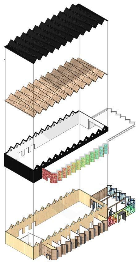 This plastic recycling facility in Vancouver’s Railtown District transforms an underutilized parking lot into a community-centered hub that addresses both plastic waste and housing insecurity. Located near a homeless encampment, the project REPURPOSES INDUSTRIAL PLASTIC into sheets and bricks used to build durable shelters, while also creating local job opportunities in the recycling process. The building is organized into three parts: a warehouse, offices, and a gallery, each constructed with folding CLT panels and REUSED TIMBER ELEMENTS to emphasize sustainability. By combining MATERIAL INNOVATION , public engagement, and social impact, the facility serves as a model for CIRCULAR ECONOMY infrastructure.