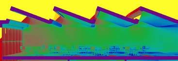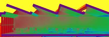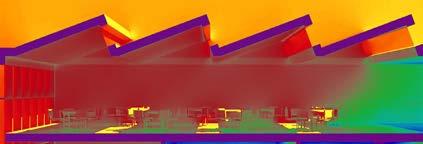 South-facing clear sawtooths bring in daylight into the mezzanine space, but it can get too bright in clear sky conditions.