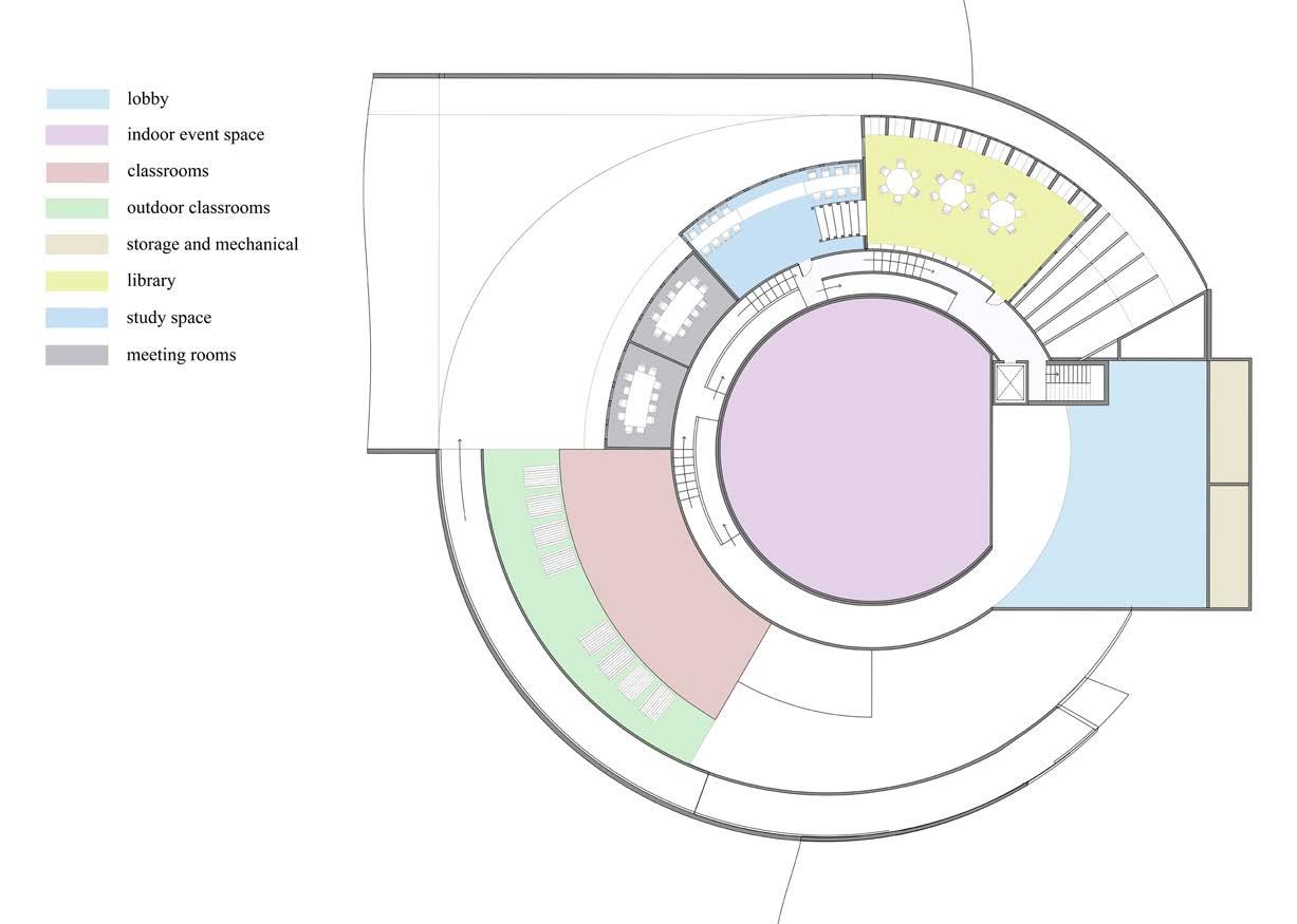 The O-Hill Community Center at UMass Amherst aims to become a vibrant hub fostering STUDENT ENGAGEMENT AND COLLABORATION , and enhance the overall campus experience by providing gathering spaces and multifunctional amenities catering to a diverse range of student needs and activities. The OHCC is a two-story building with two mezzanine levels circling around the main event space to emphasize the building’s focus on its INCLUSIVE ENVIRONMENT that encourages social interaction, learning, and well-being. The design also incorporates outdoor gathering areas, including a roof garden directly above the indoor event space.