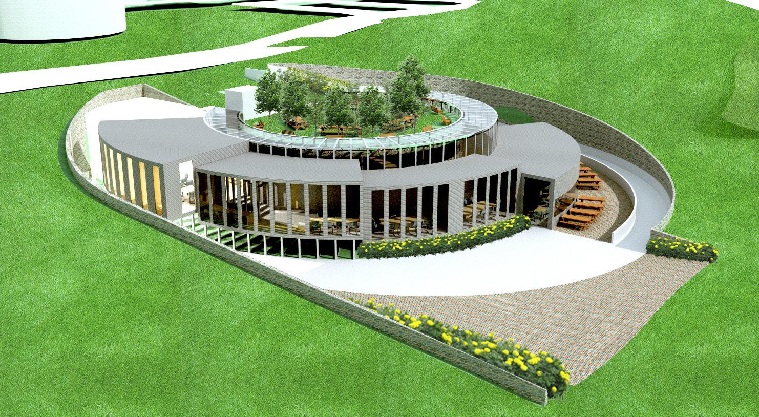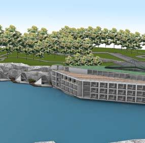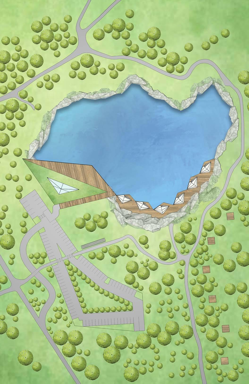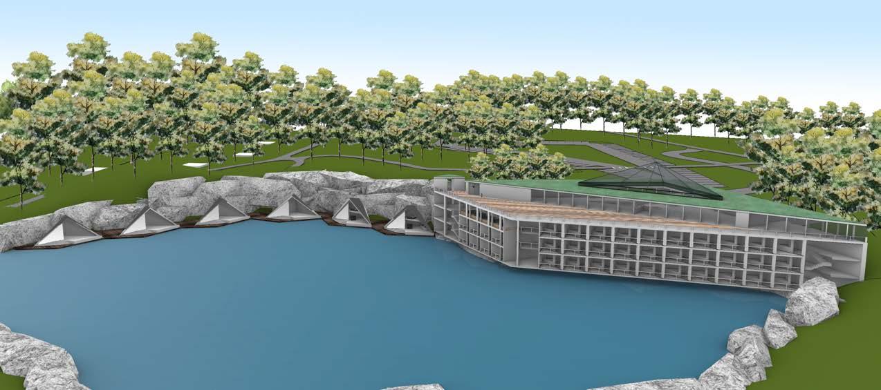 The Halibut Point Hotel and Camp is built on an OLD GRANITE MINE which now resides as the Halibut Point Quarry. The project aims to CELEBRATE the granite mine’s significant contribution to local industry before its collapse in the late 1920s. The H.P. Hotel and Camp places a strong emphasis on SUSTAINABILITY , incorporating PV panels and a green roof on the main hotel building to reduce rainwater runoff and heat island effect. Floor-to-ceiling windows and the skylight above the main stairs also aim to maximize daylighting and minimize energy loads.