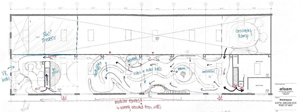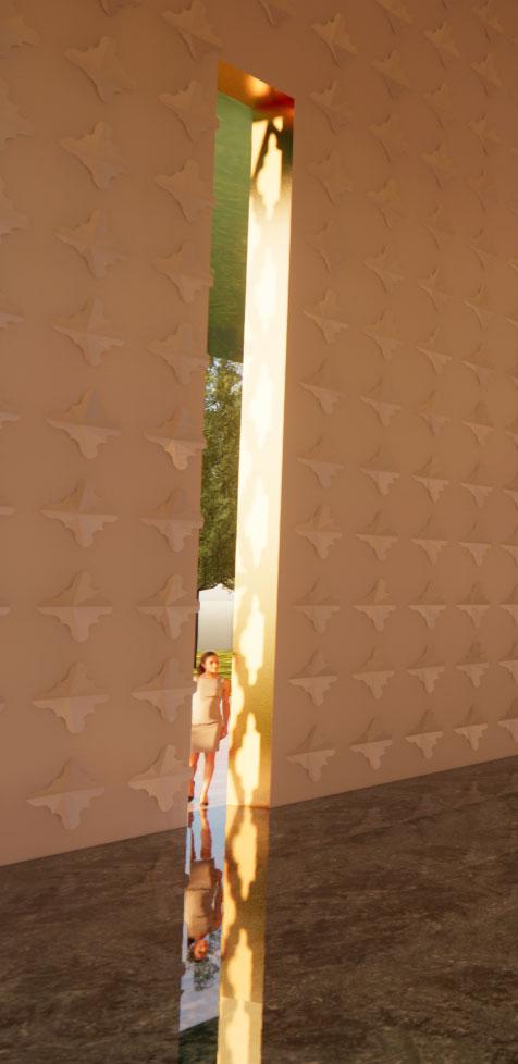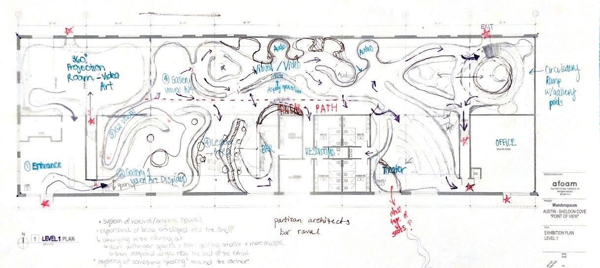 Following the principles explored in the earlier studies of Abstract Interiorities, the design of the NFT gallery transforms Wonderspaces of Austin by using organic systems of space that come to define the occupant’s experience as they interact with the NFT art in its visual, video, auditory, and interactive forms. The composition creates an immersive experience that envelops one in the interior as an organic vessel, with the 3D printed cladding reshaping the form of the building. Moreover, the combination of spatial porosity in the form of the modules and the sinuously patterned circulation add a sense of curiosity to the space. The culmination of physical and digital interiors engages the occupant and brings our relationship with the newfound art of NFTs into question.