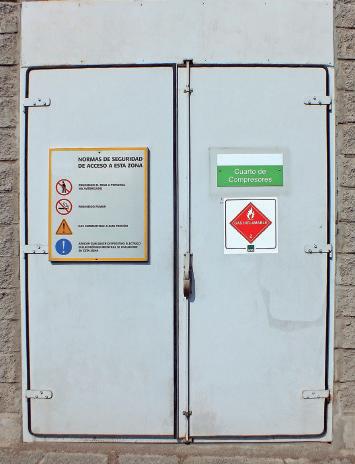 Parada de emergencias del compresor. Puerta de sala de compresor.