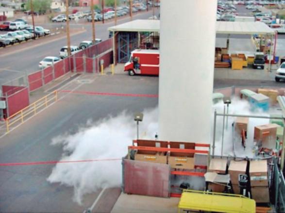 4. Visualizar el alcance de la nube de gas que avanza pegada al suelo por si es necesario ampliar la zona de aislación. El GNL produce una gran cantidad de gas a partir del líquido (1 a 600); debe tenerse en cuenta que al escapar el gas desde el estanque, sale a 162 °C bajo cero y se comporta como más pesado que el aire hasta los 104 °C bajo cero. A partir de esa temperatura pasa a ser más liviano que el aire y se eleva, diluyéndose.