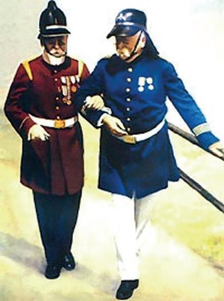 En esta fotografía se observa al Director de la Primera Compañía, Bomba Americana, y al Director de la Segunda Compañía, Bomba Germania, ambas de Valparaíso (uno inglés, el otro alemán).