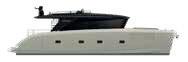 The aesthetic impact is of an elegant and balanced monohull and the space between the two hulls normally unused on traditional catamarans, conceals a garage for the tender, whose descent into the water is fully automated. The reduced width also allows the BGM75 to be moored between monohull boats and not between much larger superyachts, due to the disproportionate ratio between width and length.