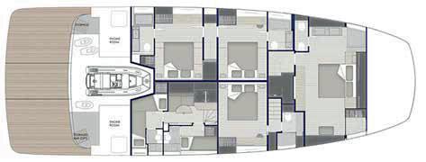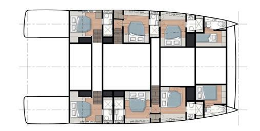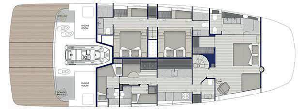 Not even in this last feature, though, can be compared to any existing catamaran on the market. Primarily because, from the first glance, the shape of the boat moves away from the “boxy” shape of a catamaran, thanks to the reduced width in favour of a ratio between beam and length closer to a monohull. This allows for the horizontal surfaces between the two hulls to connect creating a single volume as if it were a monohull; but with larger spaces and the possibility of having a full beam owner’s cabin of extraordinary dimensions. This layout is not possible on traditional catamarans, where the two hulls are too far apart to allow aforementioned connection and are arranged separately inside the two hulls.