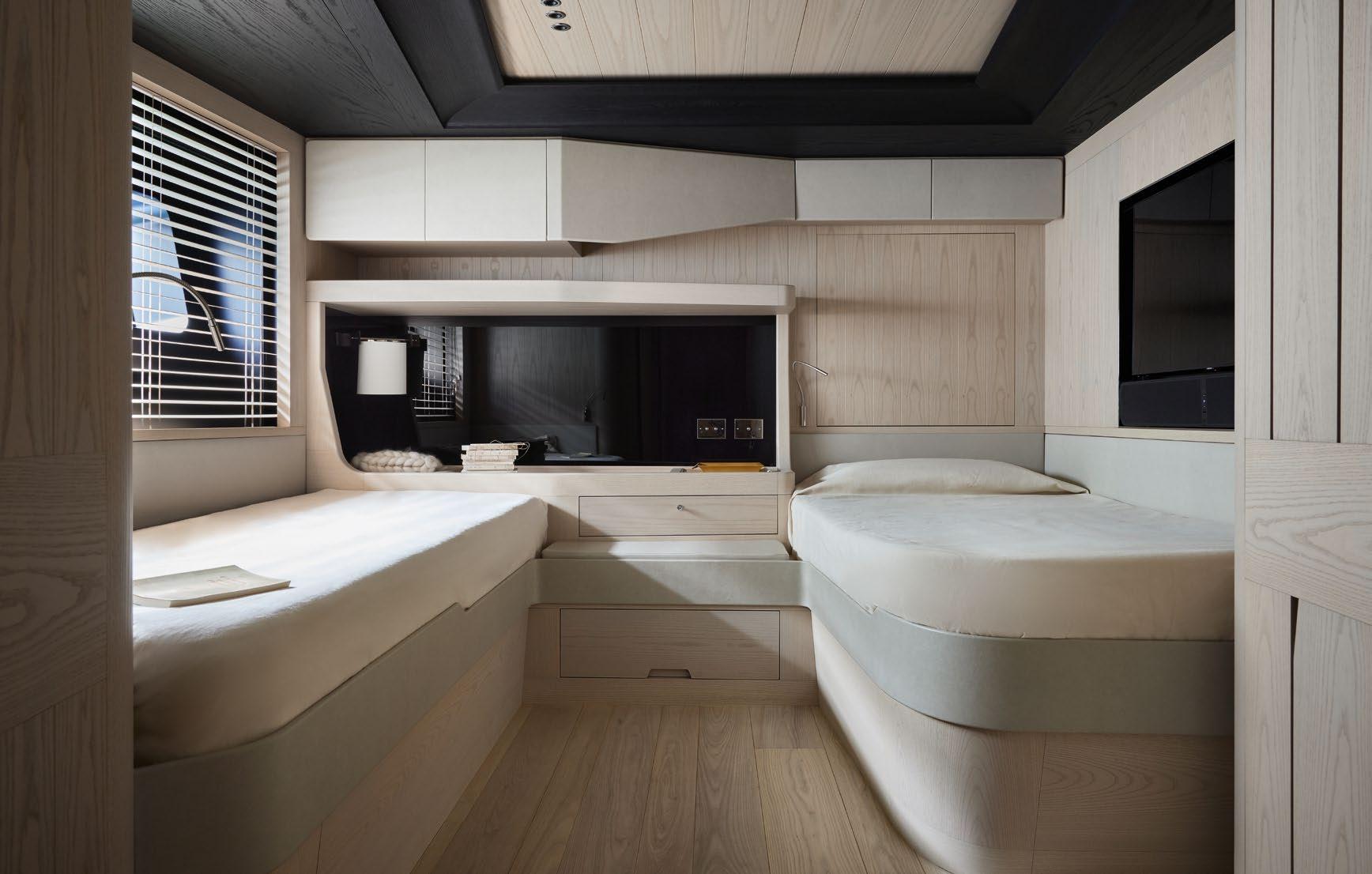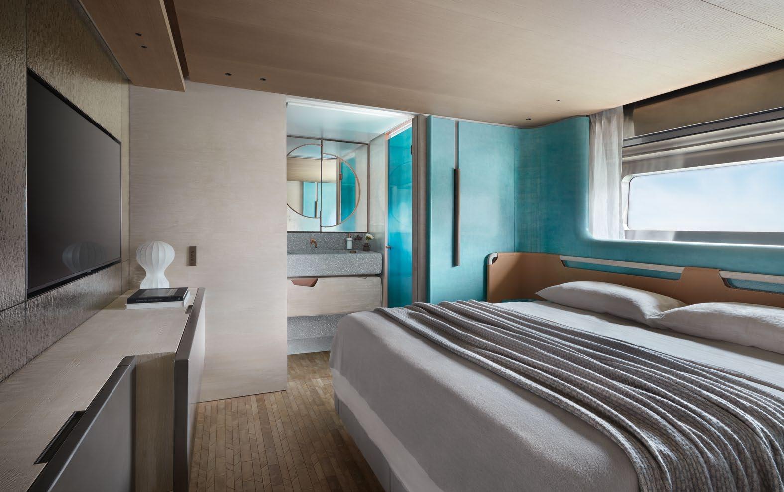 It is the interaction between the various spaces that distinguishes SD118-101, beginning with the generously and interlinked exteriors. This is thanks to the asymmetrical upper deck, which on the port side at the salon transforms the connecting walkway between stern and bow into a terrace, while on the starboard side it eliminates it altogether, favouring total visual connection with the outside world. The interiors, designed by the Parisian architectural practice Bismut & Bismut, profit from a décor composed of a few sophisticated pieces that blend perfectly into the marine context. In the salon, relaxing tones reign for the two sofas, the armchair, a 90s-style designed by Marc Newson, and the lacquered coffee table. The same tones extend to the walls, in blanched oak with a three-dimensional effect finish. In the owner's cabin, with its cloudy azure lacquered walls, there is a custom-designed bed on the port side which faces a small living and study/vanity area. In the bow, concealed behind doors, is the bathroom and a direct exit outside, perfect for the owner's privacy.