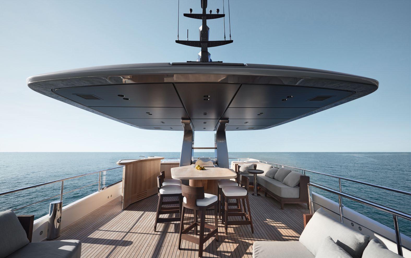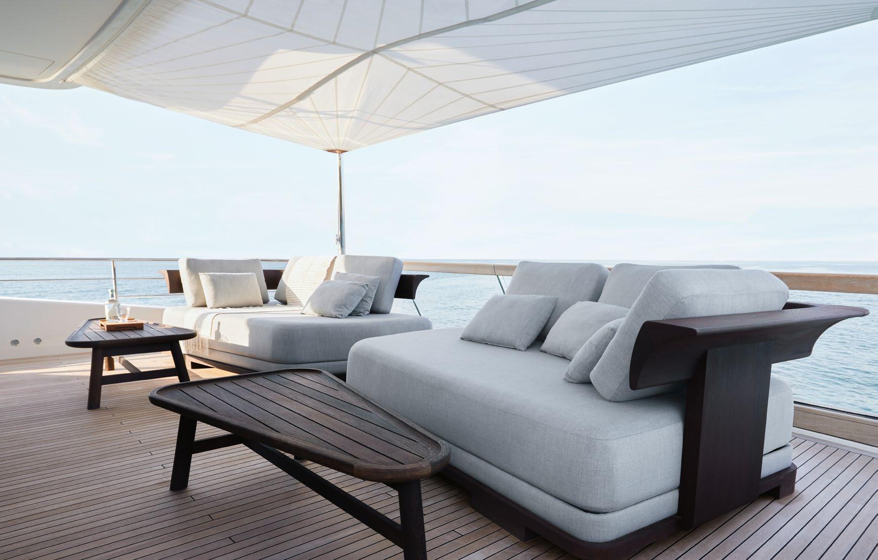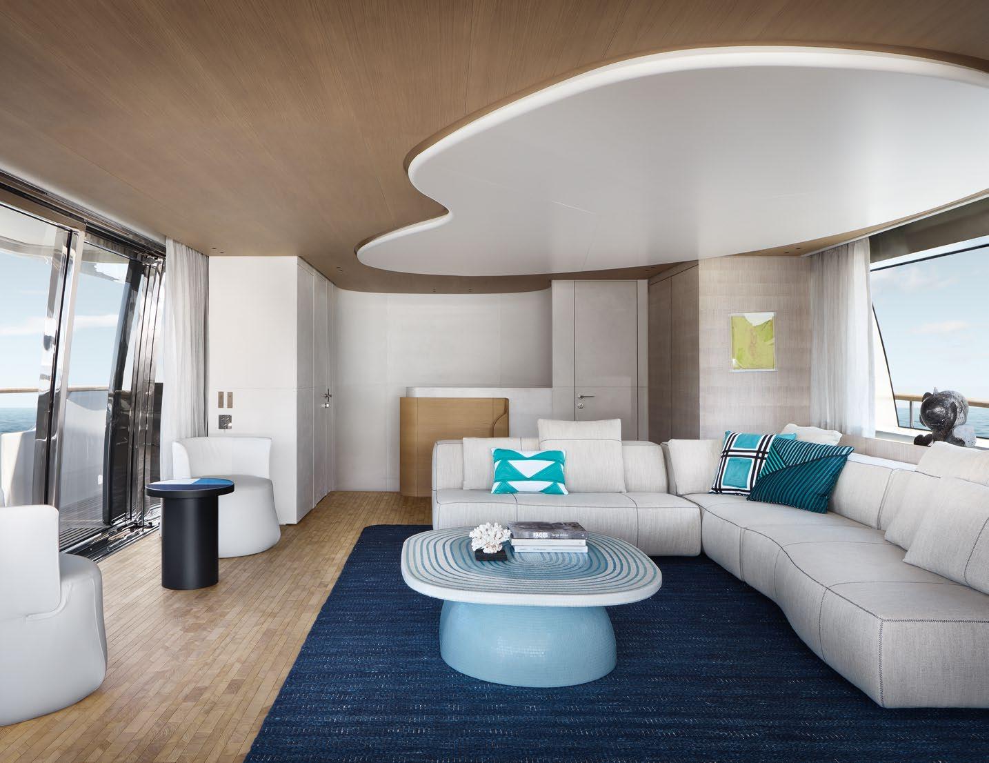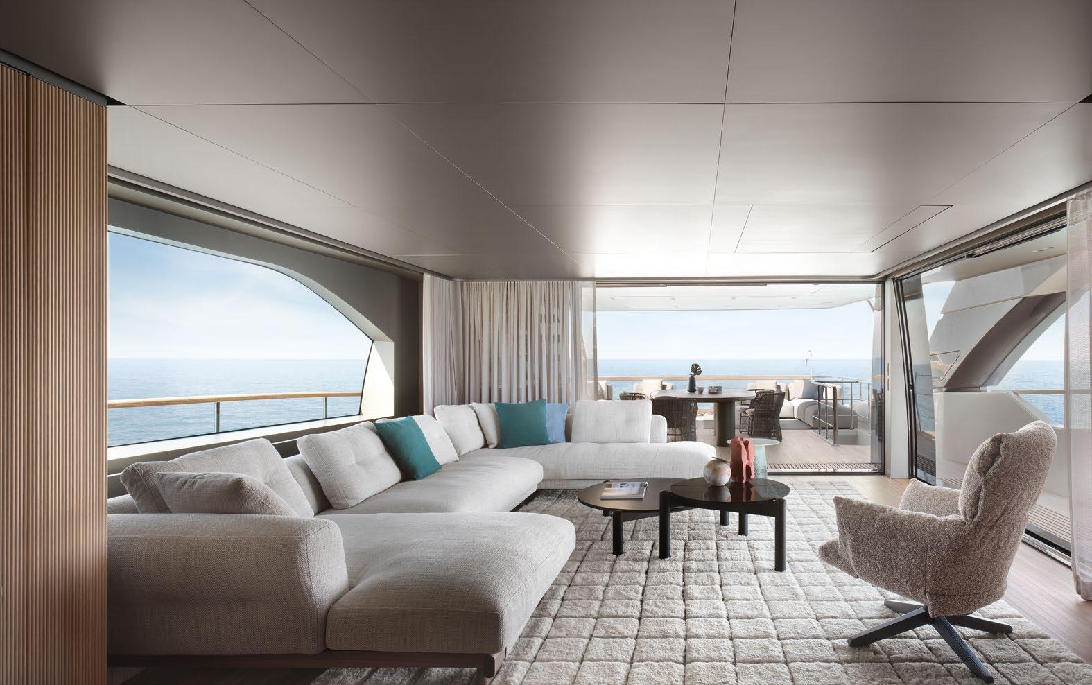 On board the SD118-105, with its interior designed by architect and designer Patricia Urquiola, the impression is one of simple yet sophisticated comfort. Natural hues and the strong presence of wood characterise the living area: cannulated oak for the boiserie and Burma teak with dove-coloured inserts for the slatted parquet. The nickel-coloured lacquered ceiling and the pale grey carpet with its geometric motif visually enclose the conversation area. Particularly spectacular is the staircase, separated by a perforated metal panel inspired by creels from which one descends to the lower deck where four cabins are located. At the bow, the owner's cabin is furnished with a large bed with its headboard in leather and a spacious full-beam dressing room which is concealed behind the cannulated boiserie. The upper deck is spacious and flexible thanks to the innovative asymmetrical configuration, which creates a proper terrace overlooking the sea. Generous seating and an oval table grace the outdoor area, where a large sofa dominates, on which to lounge, letting the gaze wander between sea and sky.
