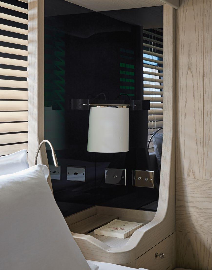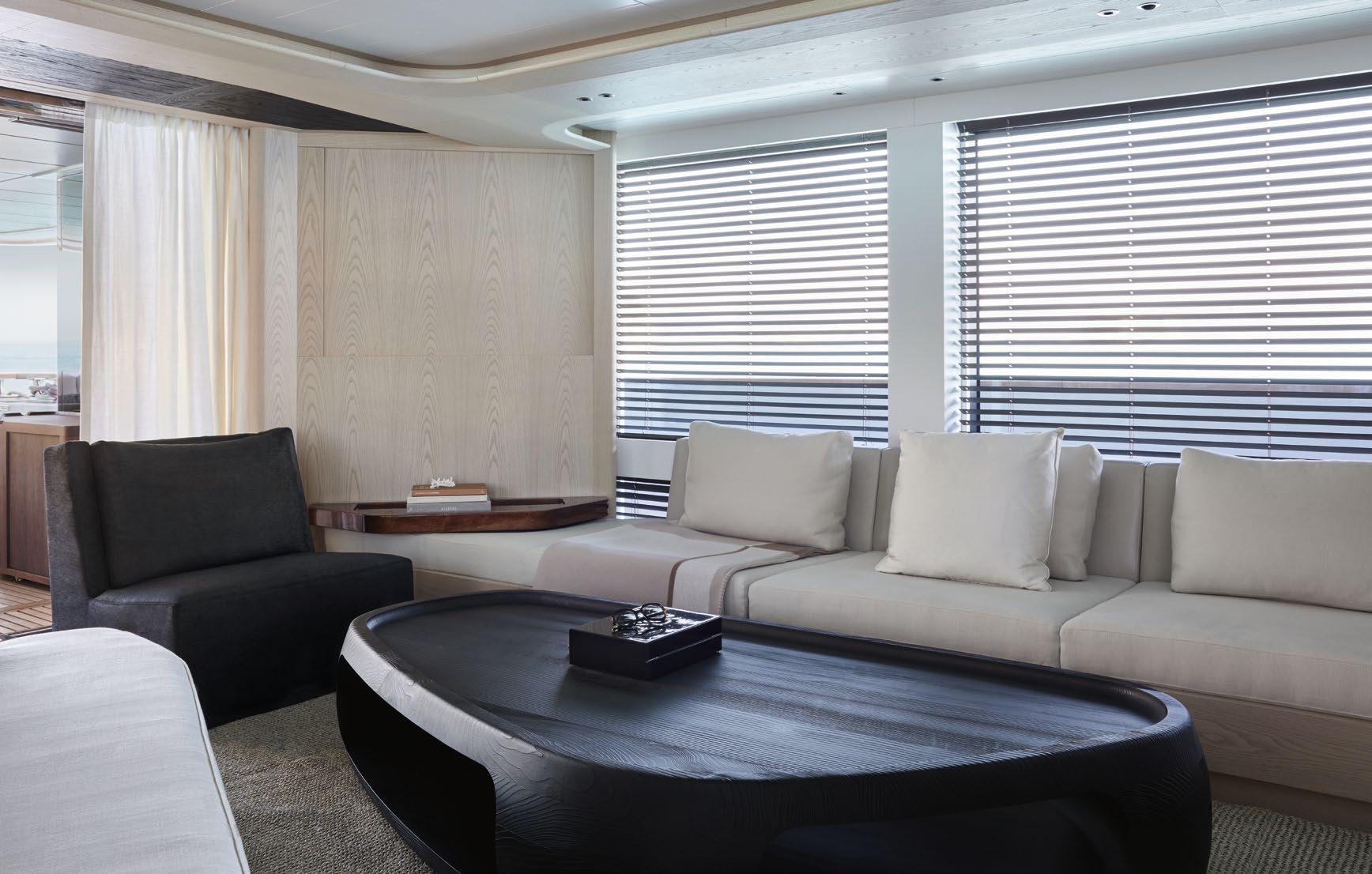 The architecture of the spaces is the leitmotif of this navetta, designed by Paris-based studio Christian Liaigre. The focus on ensuring that guests are made to feel at their most comfortable is underlined by the sophisticated simplicity of the furnishings, which are arranged to create a dialogue with each other. The relaxed atmosphere is accentuated by the choice of muted tones: bleached brushed ash for the parquet, walls and ceiling, broken up by areas of dark oak. The same contrasts apply to the furnishings, all designed by Liaigre, in which white and natural tones dominate, with a few touches in dark leather and polished mahogany. The owner's suite is introduced by a large wardrobe area set against a study area integrated into the bulwark. The choice for the upper deck has been a club lounge atmosphere in dark tones, with an angular sofa in grey leather and polished mahogany, burnt-coloured velvet armchairs and a table with a green marble top, all custom designed by Liaigre.