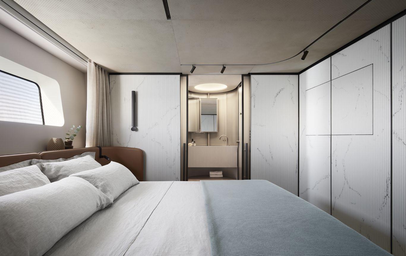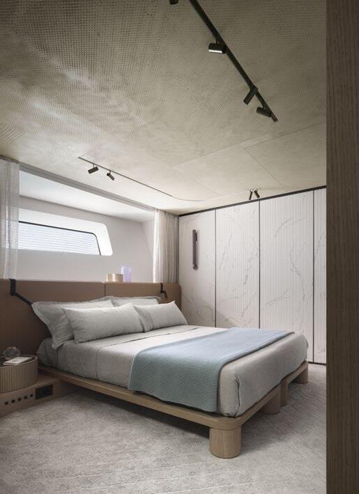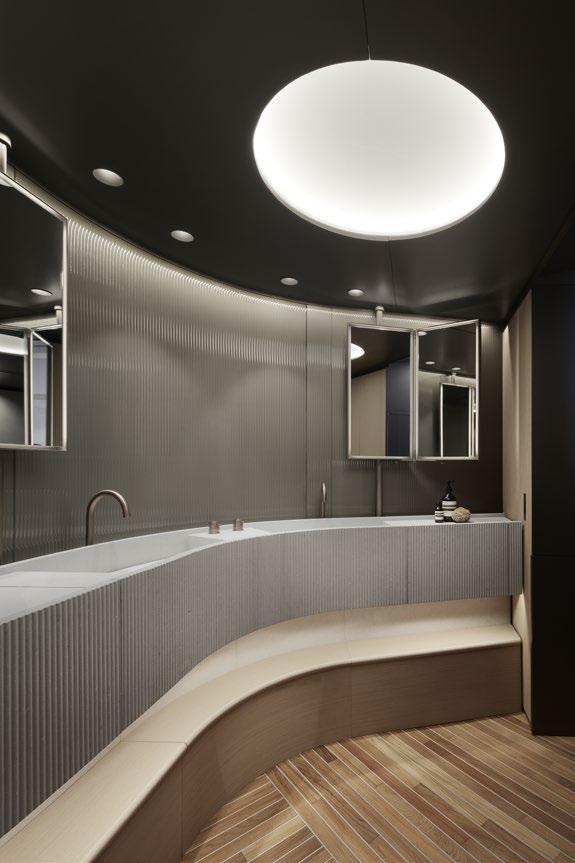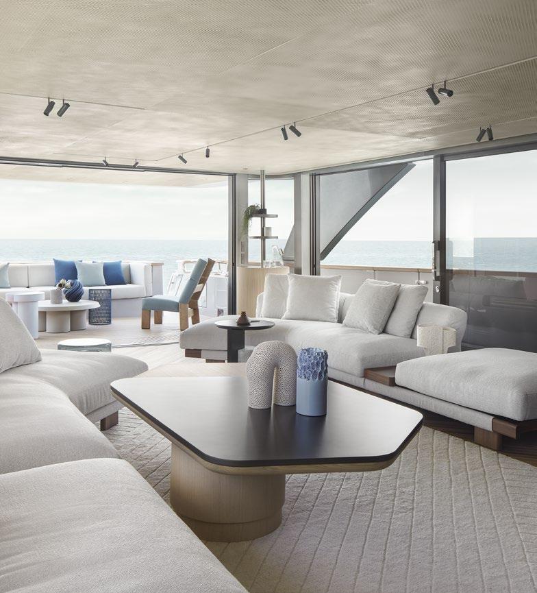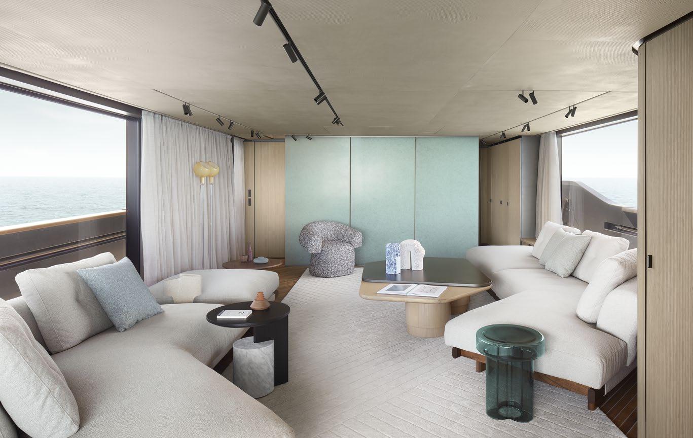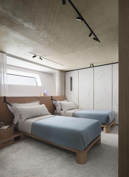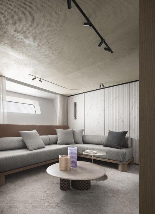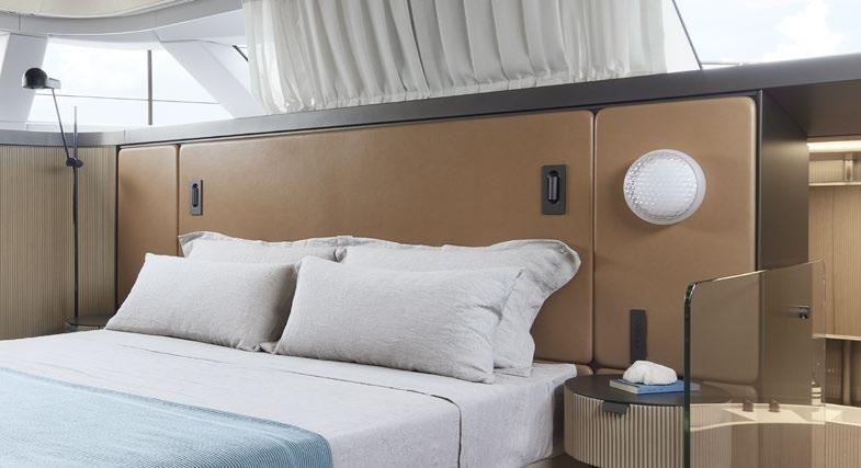The entire structural design approach considers the use of sustainable, state-ofthe-art materials. In the interior decor too, great care has been taken to use materials of the highest quality and from alternative sources. Materials made from shells and recycled paper may be used, achieving high levels of quality in the upholstery on board. Woods are carefully selected to ensure a lower environmental impact. Bioresins are used for the interior details of the ceilings and furnishings. To protect teak, now at risk of deforestation, we support research into more sustainable and long-lasting alternative materials for use on exterior decks. Recycled nylon textile fibres offer many possibilities. Recycled glass is Bioglass.