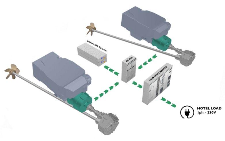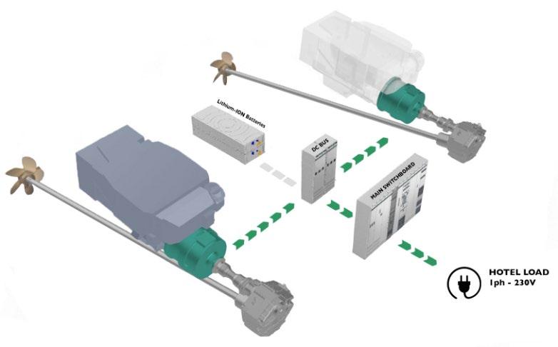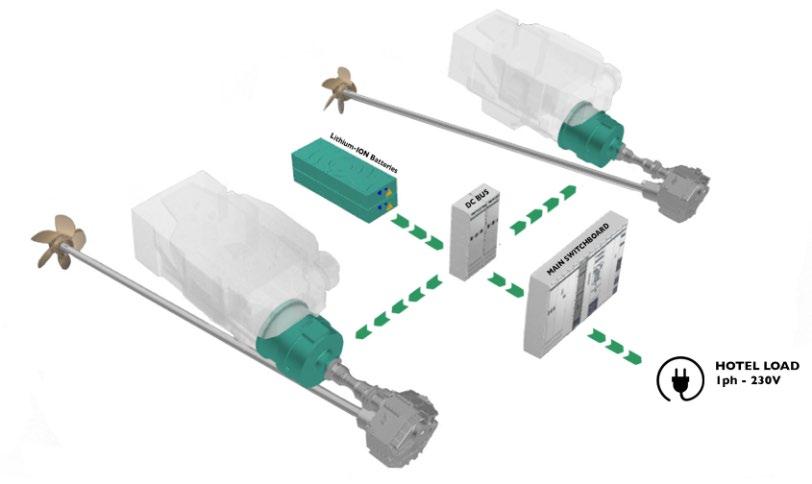 E-motors manage hotel load and/or fast recharge the batteries (Full recharge in 1 hour starting from 10 to 14kn)