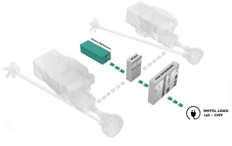 For limited autonomy it is possible to navigate and/or maneuver with zero emissions: all the internal combustion engines are turned off and then the energy for propulsion and hotel loads is taken from the lithium-ion batteries only.