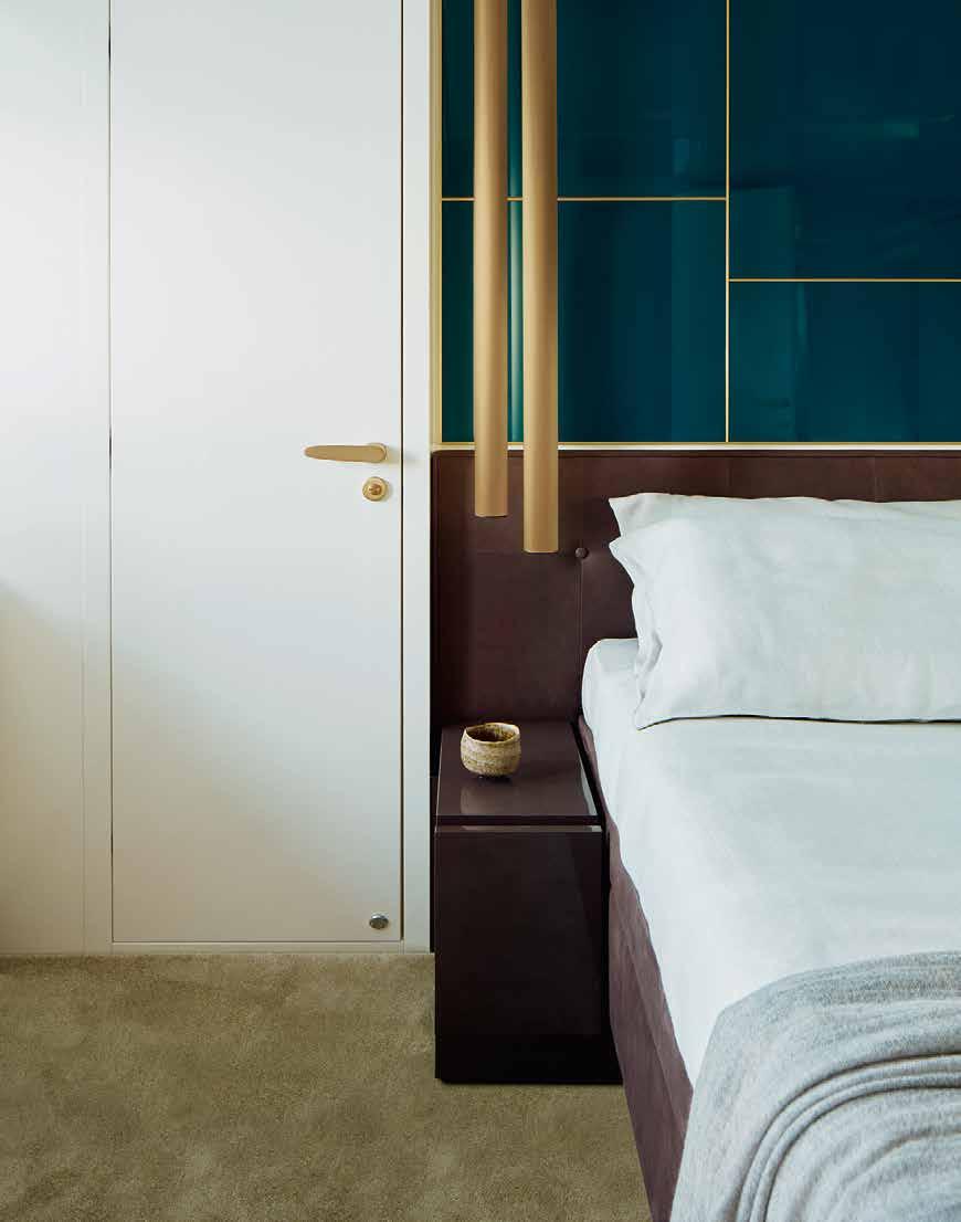 Detail of the master cabin with headboard in backpainted glass and brass inserts.