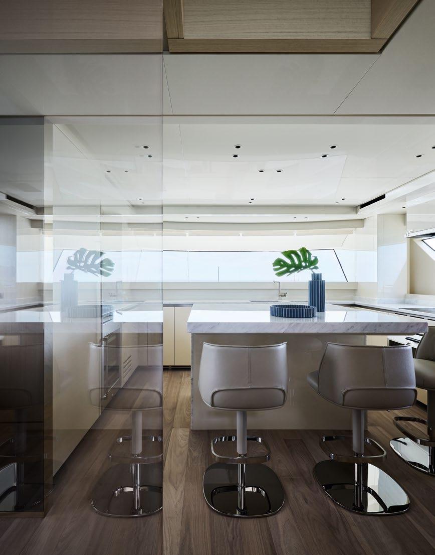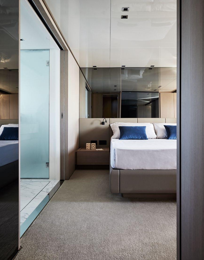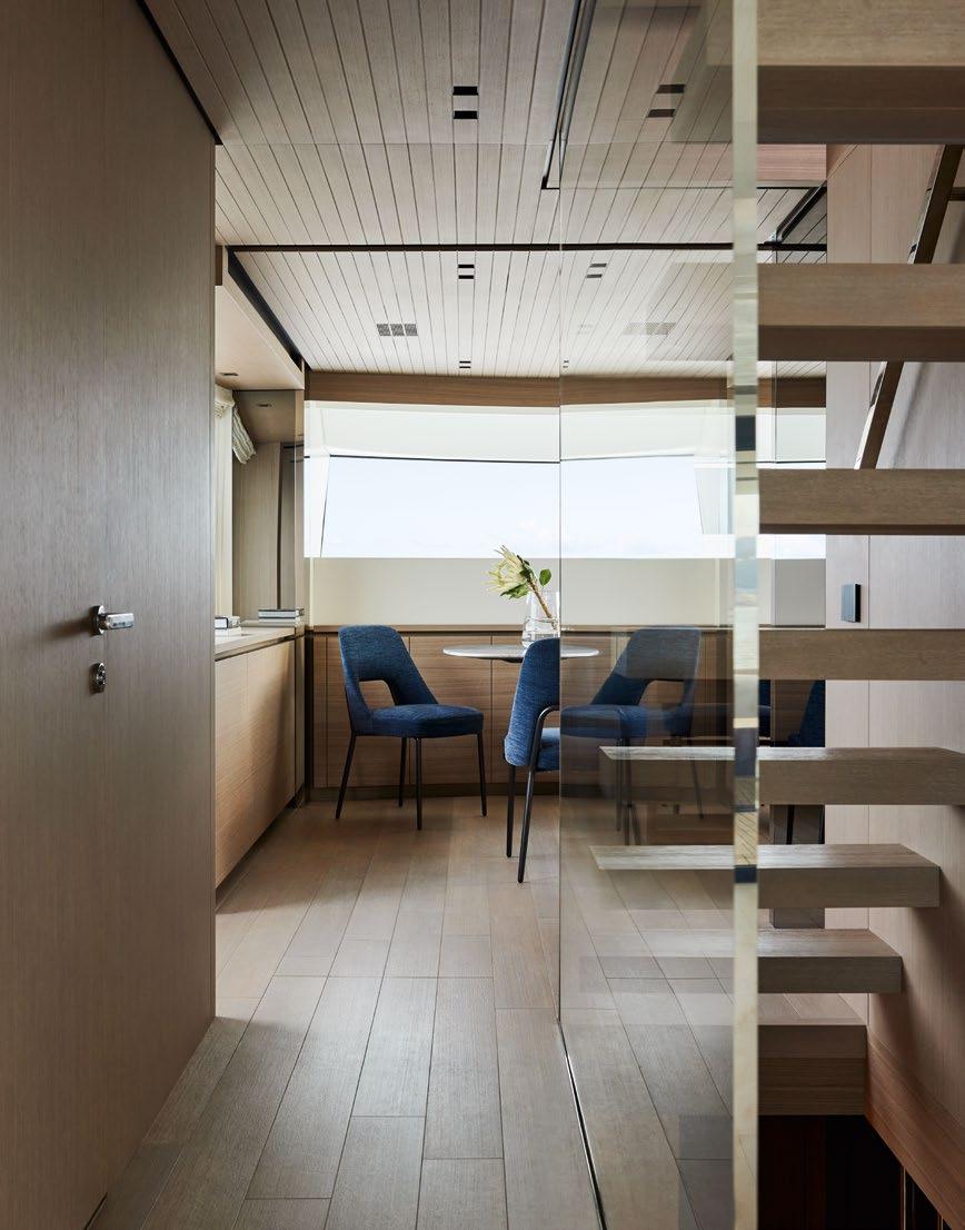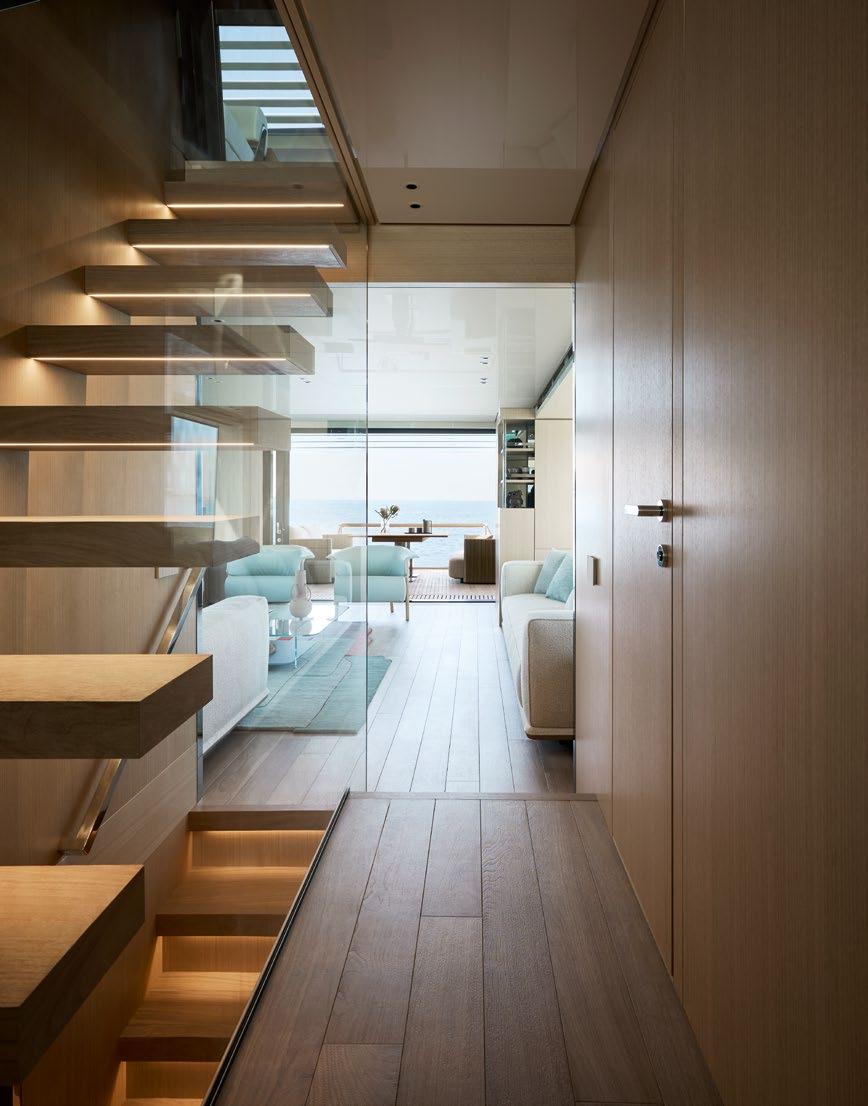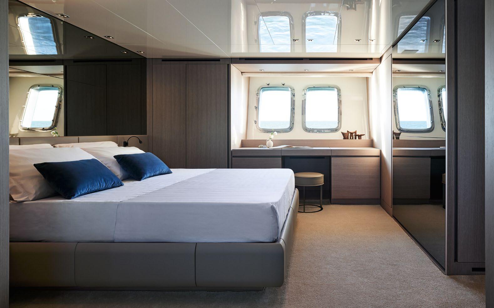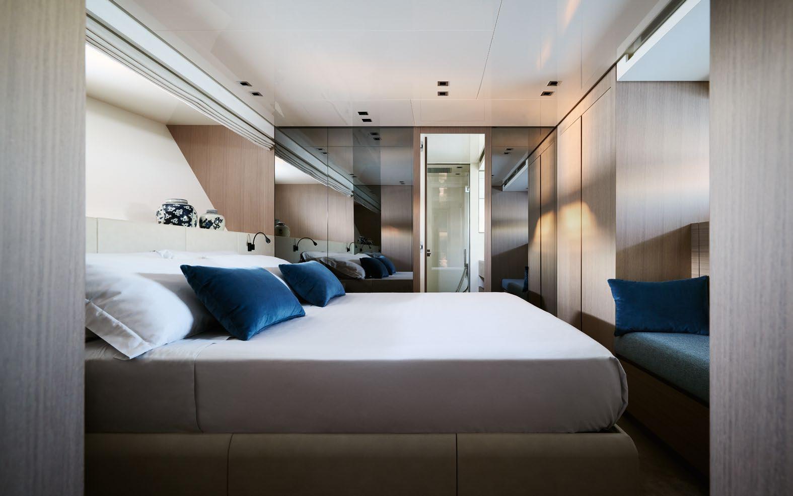 Lightness, delicacy. Credit goes to the materials – the eucalyptus wood chosen for the custom side cabinets and coffee tables and for the wall coverings, the cream-colored lacquer of the clerestory windows, the natural oak parquet found throughout the main deck, including the kitchen. The only note of contrast is the carpet whose nuanced light blues and greens match up with details ranging from pink and red to violet. Two other keywords are transparency and reflections: vast picture windows bring the sea inside, while mirrored areas alternate with eucalyptus walls. The main deck continues forward with an open-space kitchen, which incorporates the natural hues of the living area and features a counter with stools and a Carrara marble top. On the lower deck, the four cabins reiterate the same stylistic motifs as the main deck: eucalyptus wood wall coverings, natural colored furniture, mirror and glass detailing.