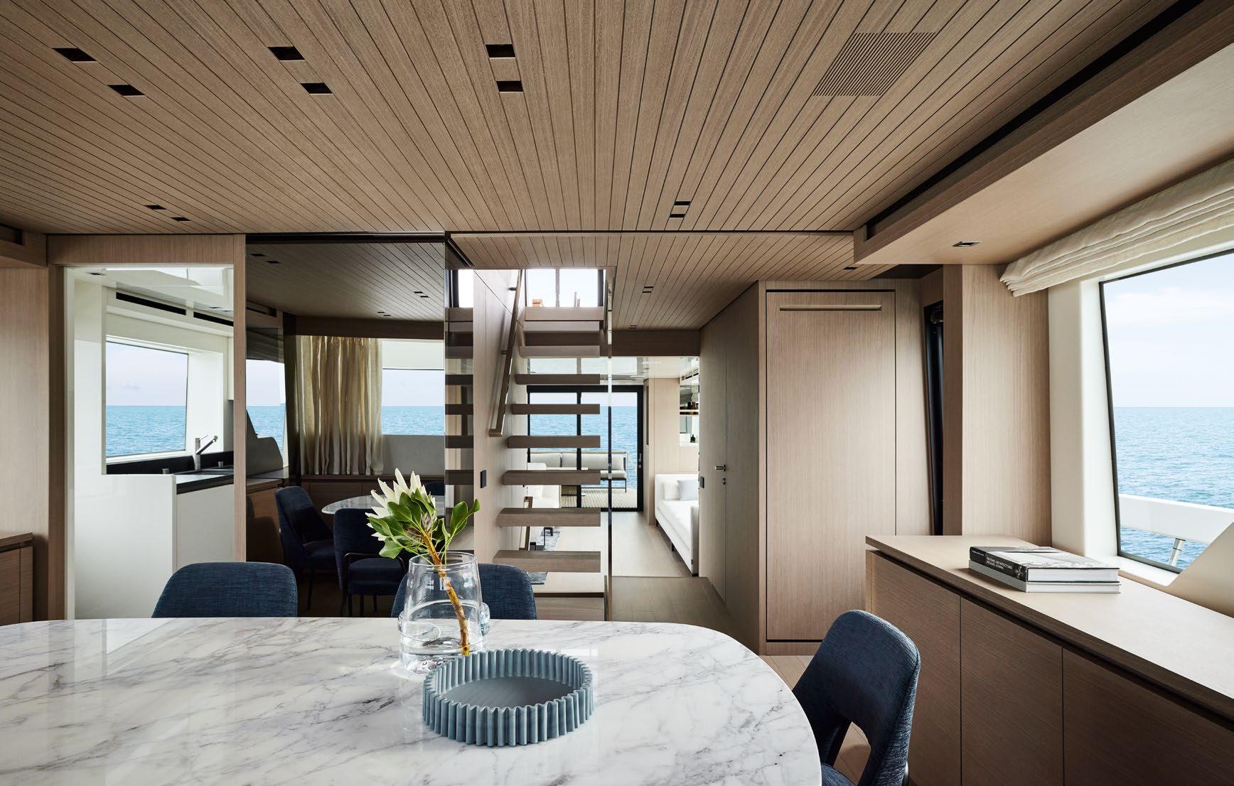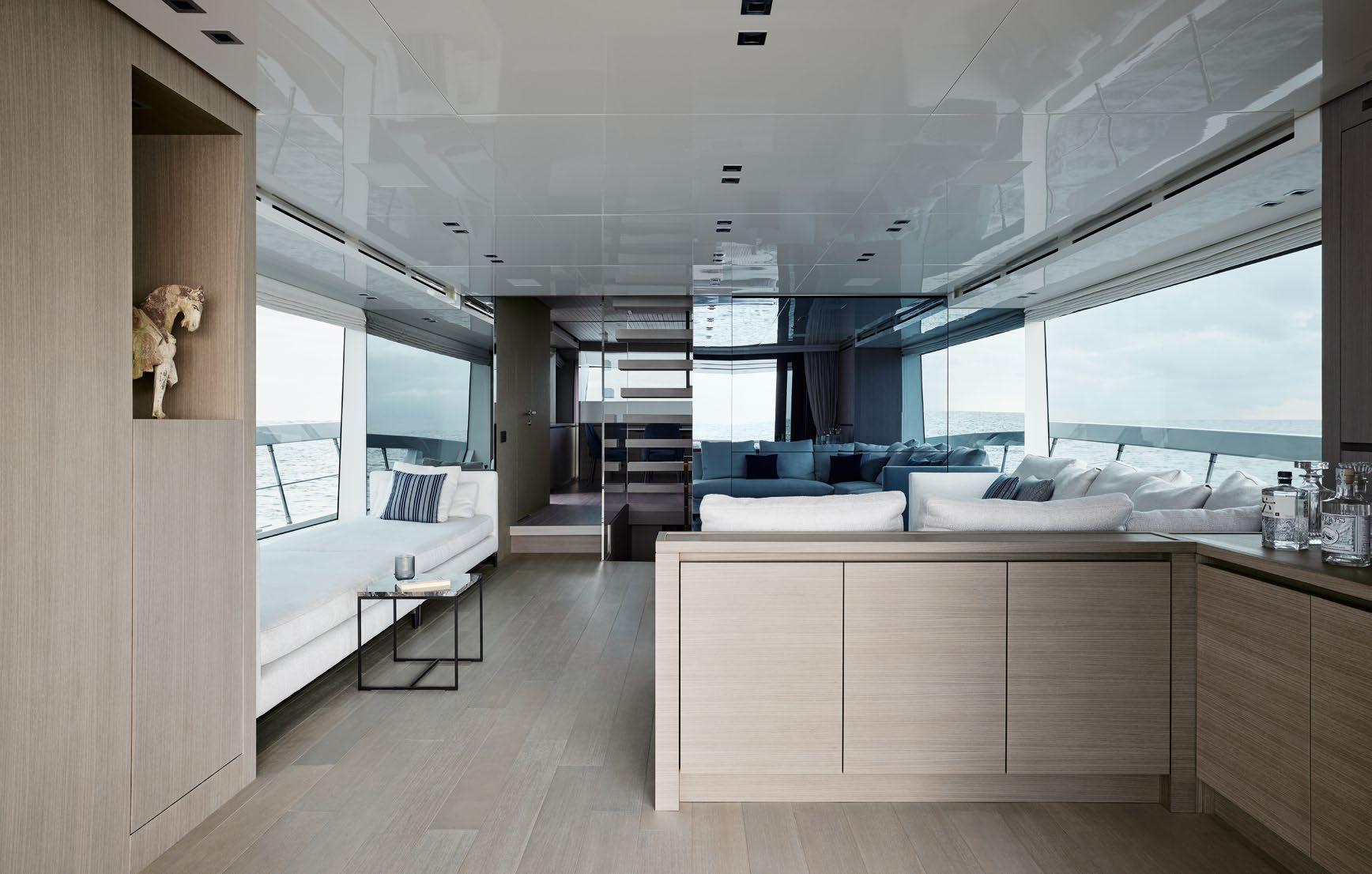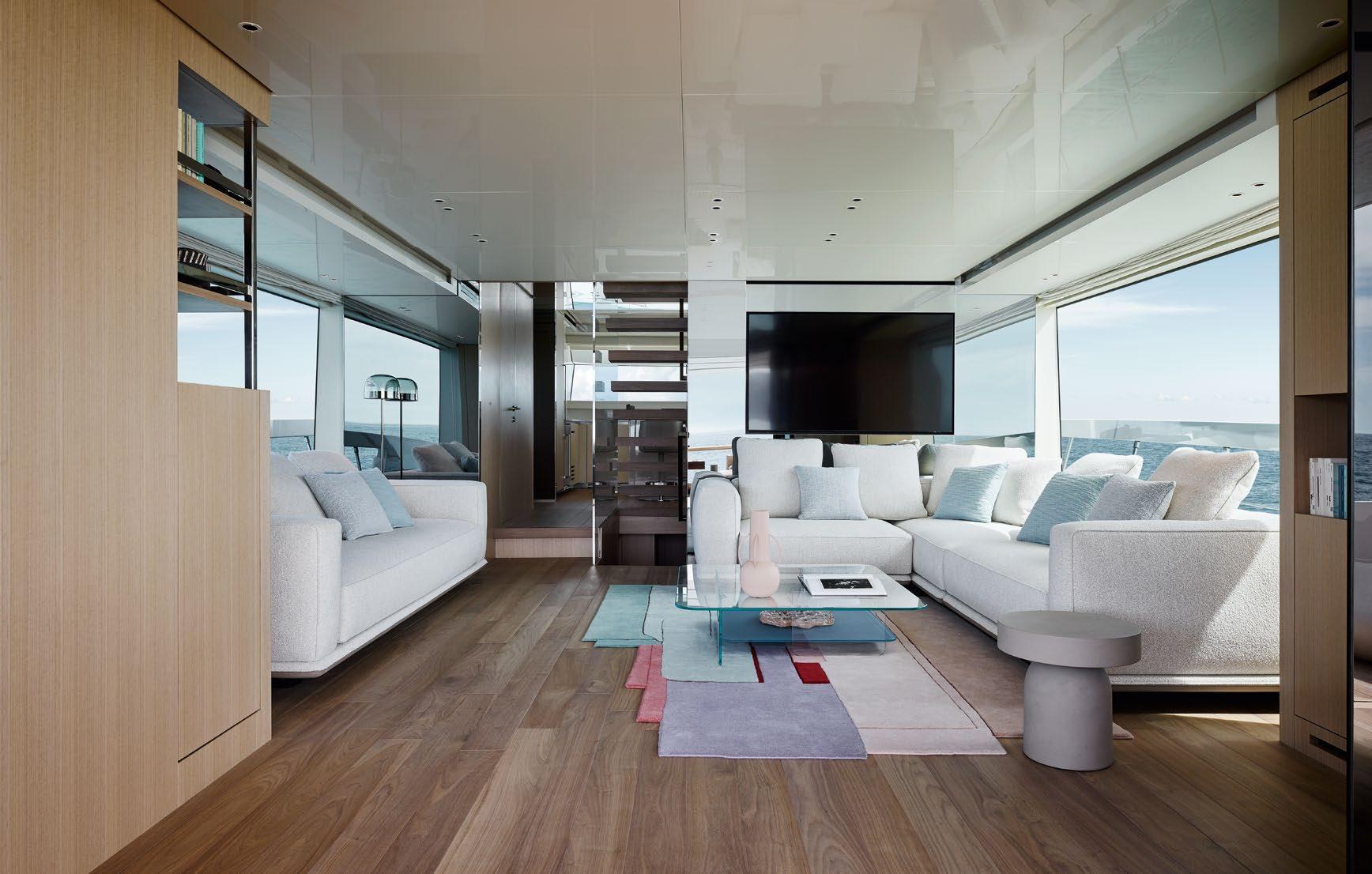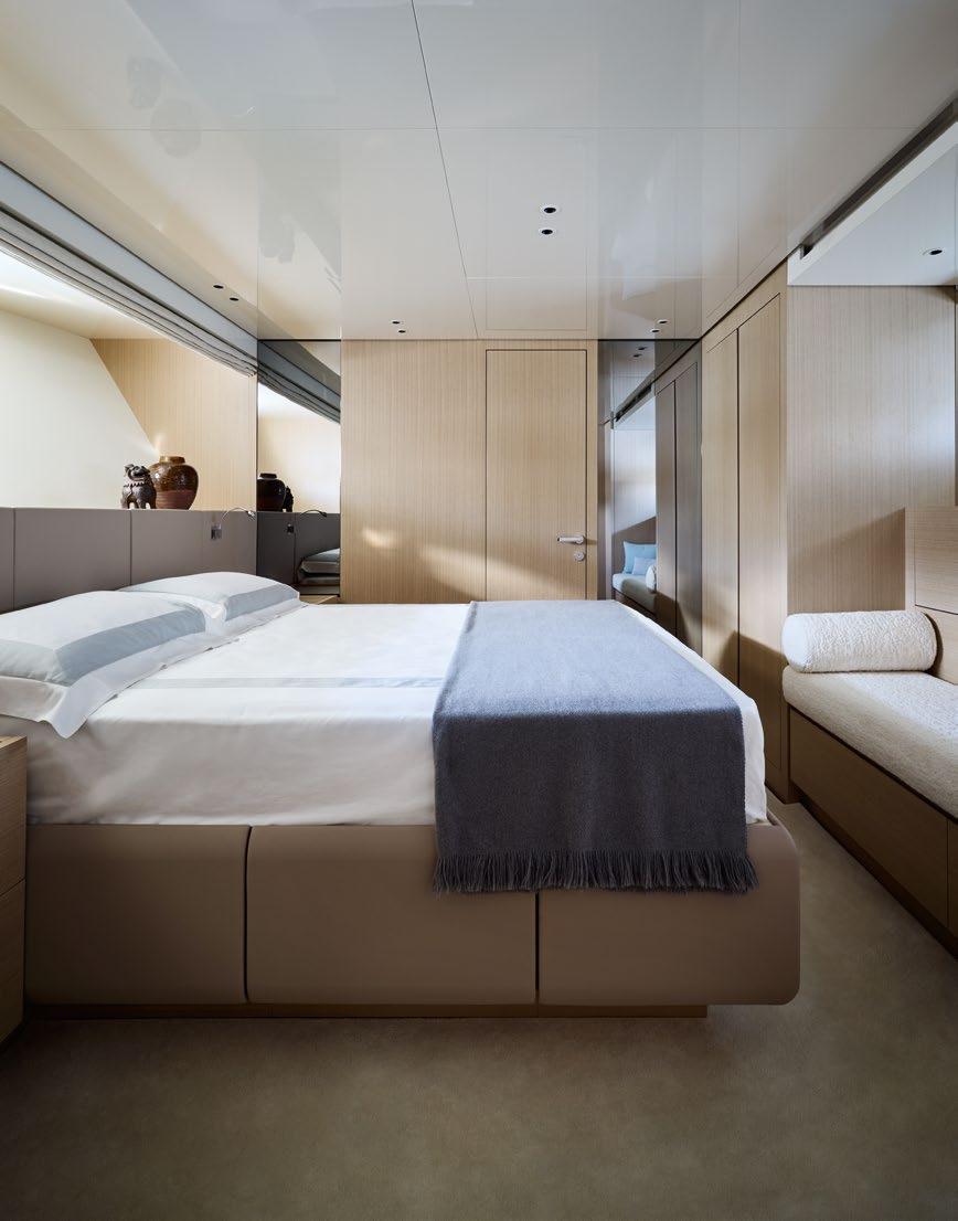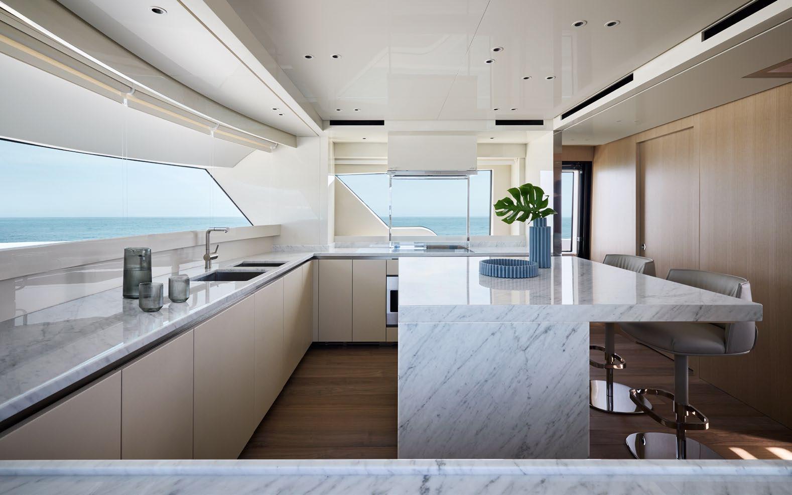 Lightness, delicacy. Credit goes to the materials – the eucalyptus wood chosen for the custom side cabinets and coffee tables and for the wall coverings, the cream-colored lacquer of the clerestory windows, the natural oak parquet found throughout the main deck, including the kitchen. The only note of contrast is the carpet whose nuanced light blues and greens match up with details ranging from pink and red to violet. Two other keywords are transparency and reflections: vast picture windows bring the sea inside, while mirrored areas alternate with eucalyptus walls. The main deck continues forward with an open-space kitchen, which incorporates the natural hues of the living area and features a counter with stools and a Carrara marble top. On the lower deck, the four cabins reiterate the same stylistic motifs as the main deck: eucalyptus wood wall coverings, natural colored furniture, mirror and glass detailing.