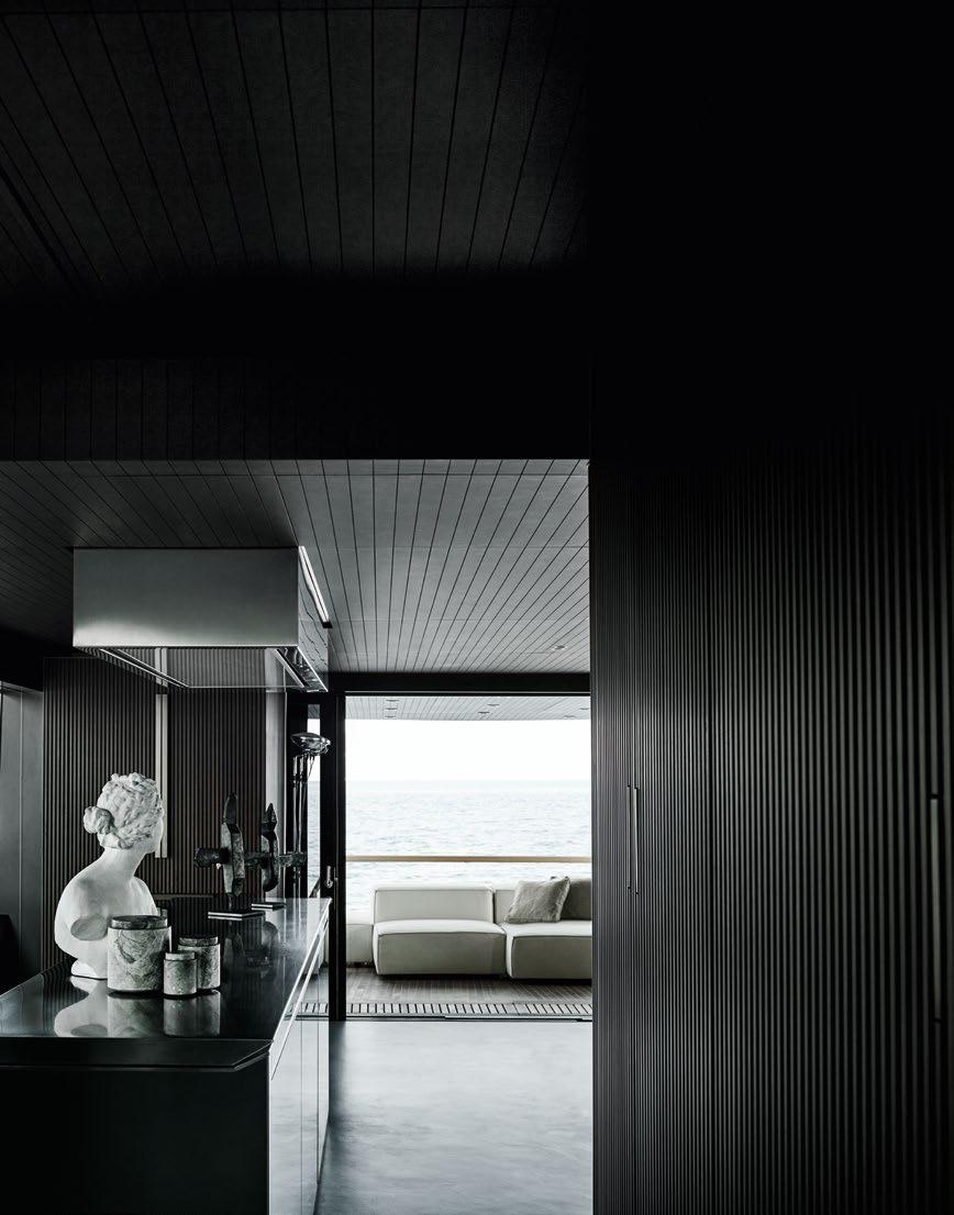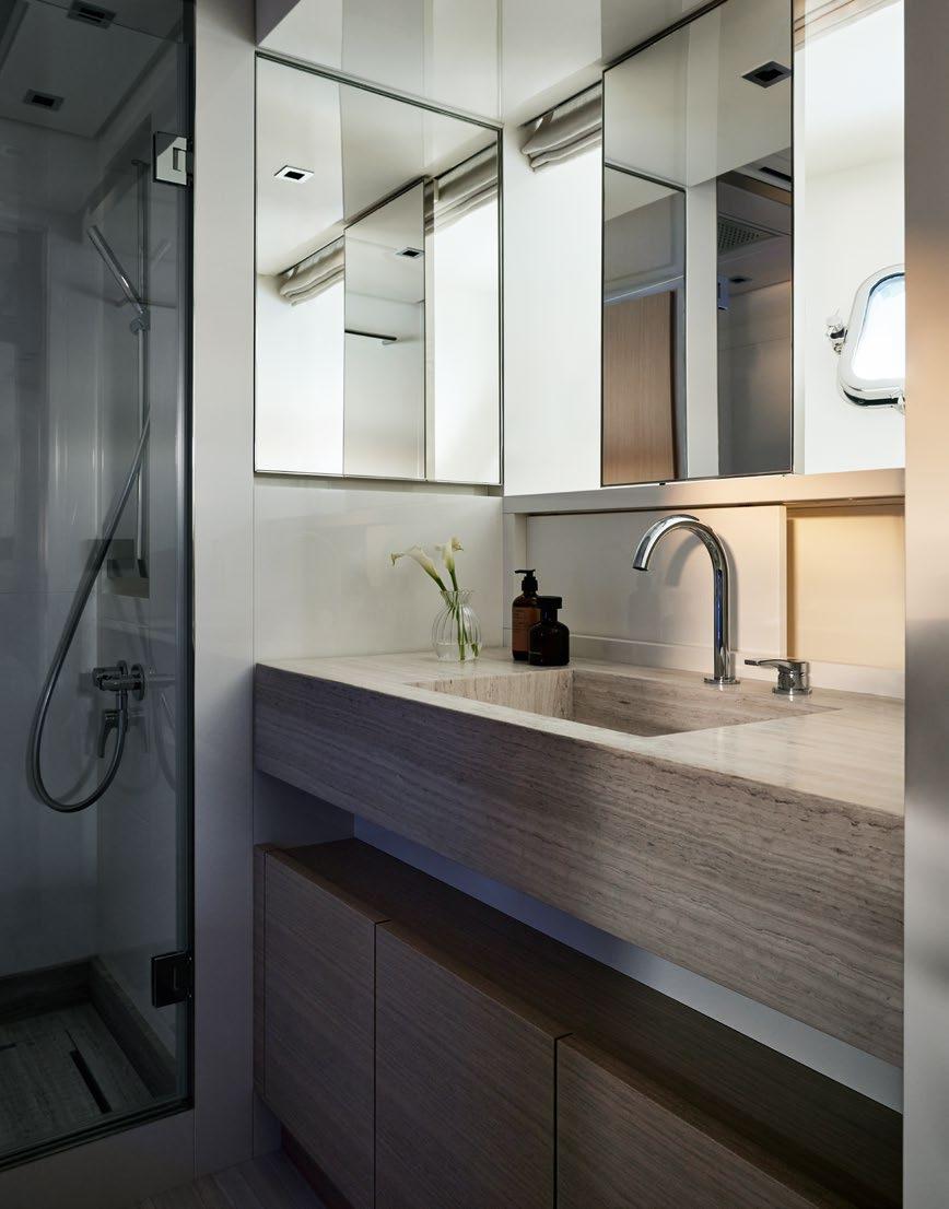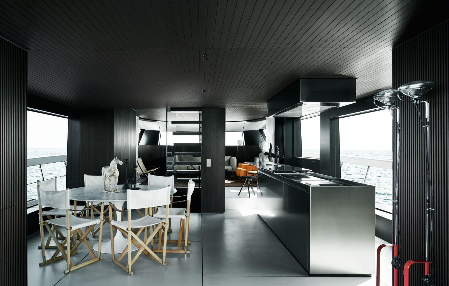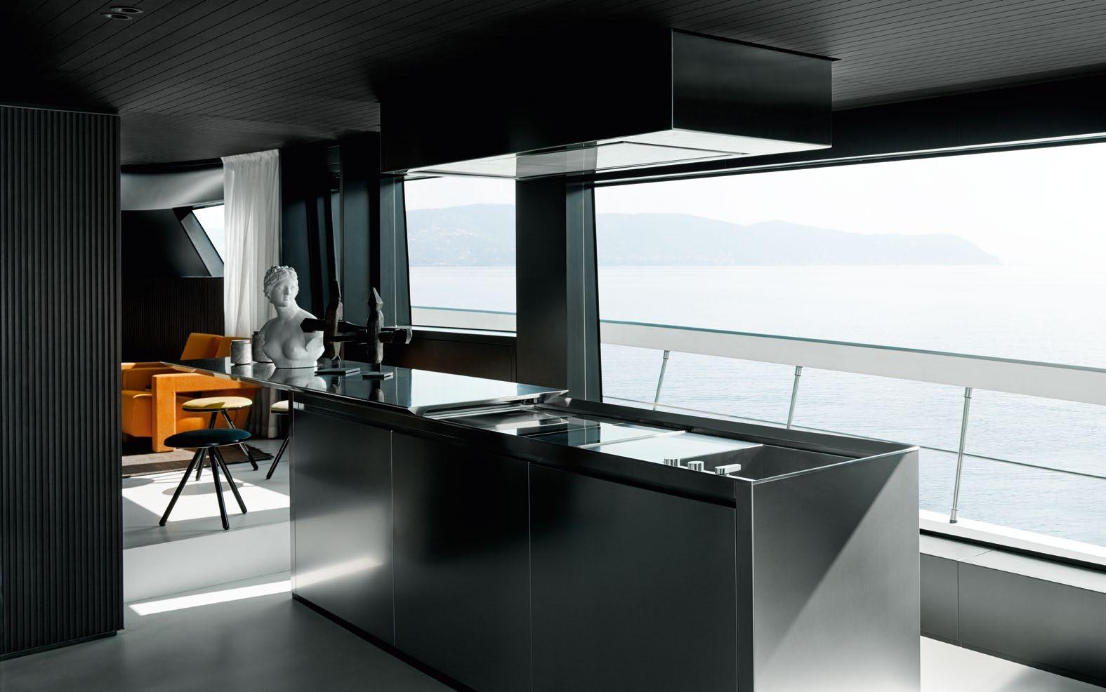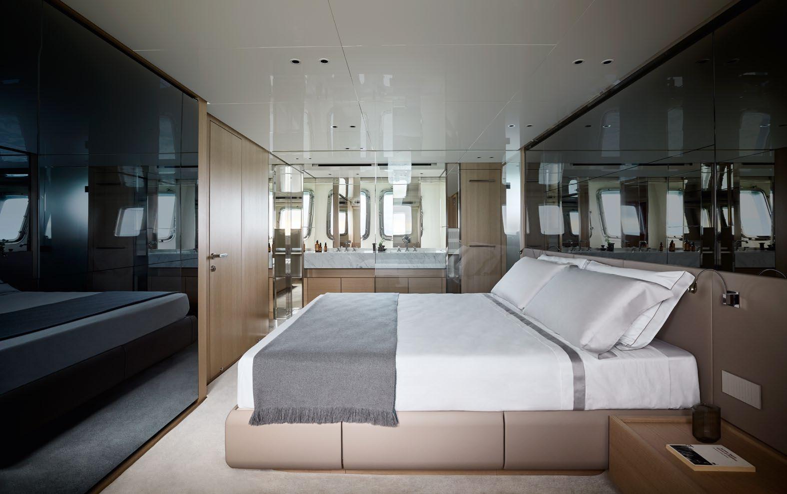 Lightness, delicacy. Credit goes to the materials – the eucalyptus wood chosen for the custom side cabinets and coffee tables and for the wall coverings, the cream-colored lacquer of the clerestory windows, the natural oak parquet found throughout the main deck, including the kitchen. The only note of contrast is the carpet whose nuanced light blues and greens match up with details ranging from pink and red to violet. Two other keywords are transparency and reflections: vast picture windows bring the sea inside, while mirrored areas alternate with eucalyptus walls. The main deck continues forward with an open-space kitchen, which incorporates the natural hues of the living area and features a counter with stools and a Carrara marble top. On the lower deck, the four cabins reiterate the same stylistic motifs as the main deck: eucalyptus wood wall coverings, natural colored furniture, mirror and glass detailing.