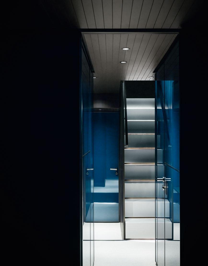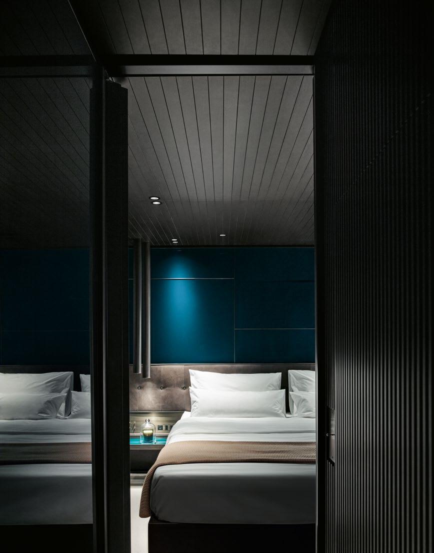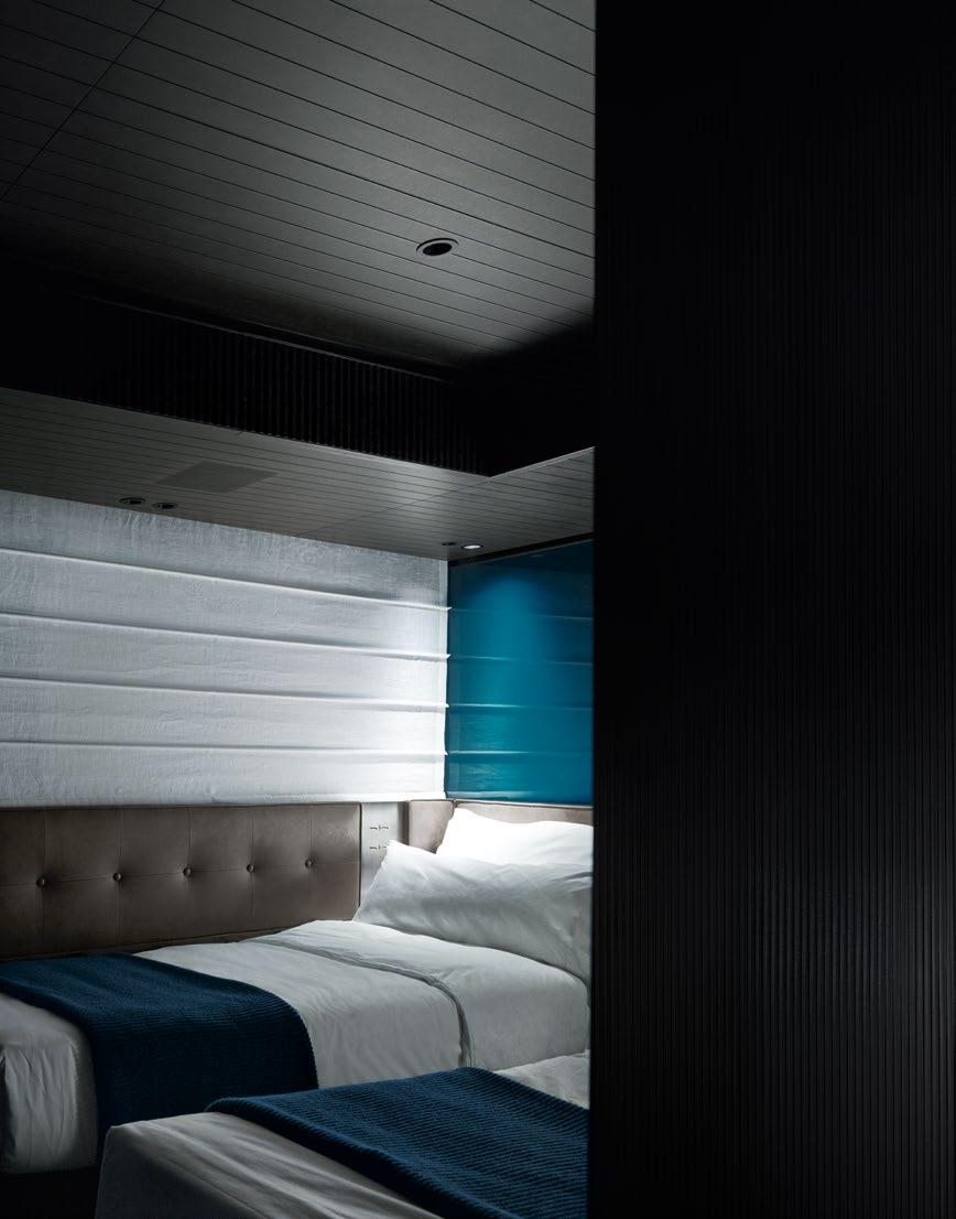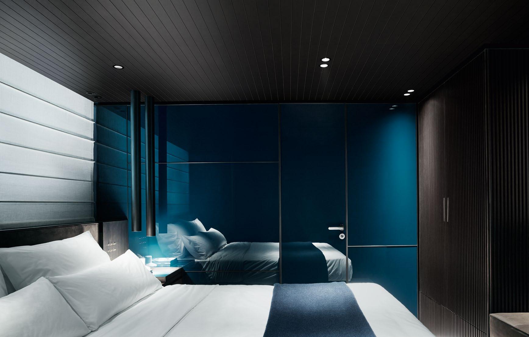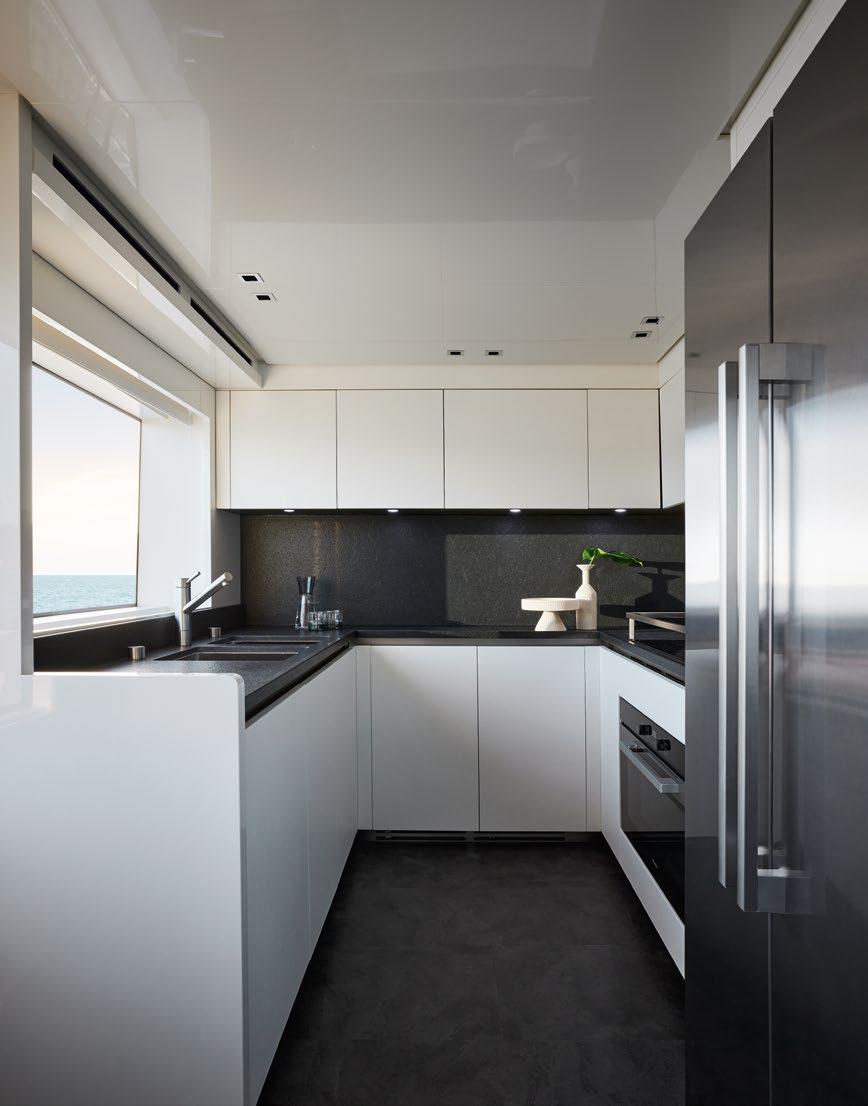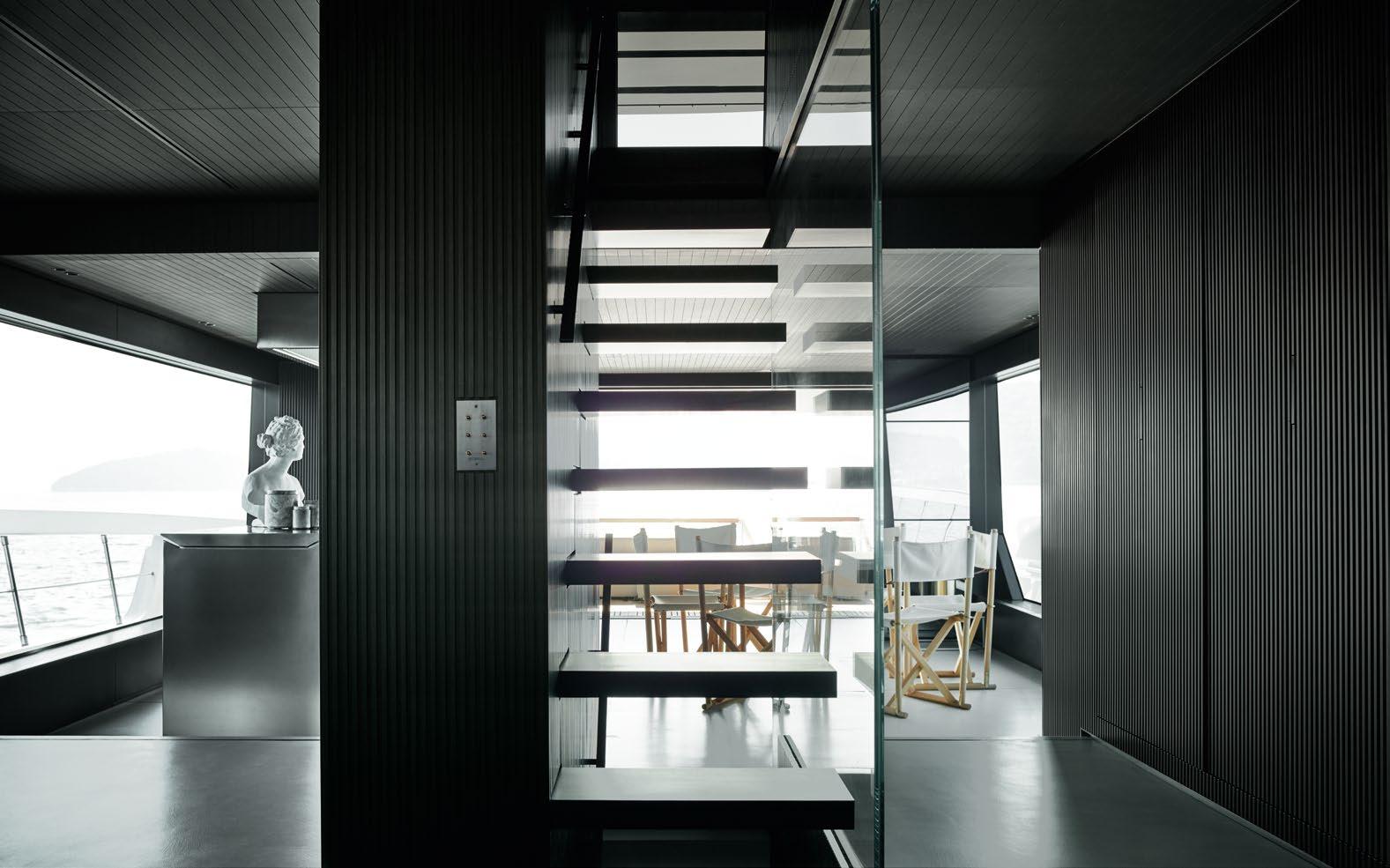 Lightness, delicacy. Credit goes to the materials – the eucalyptus wood chosen for the custom side cabinets and coffee tables and for the wall coverings, the cream-colored lacquer of the clerestory windows, the natural oak parquet found throughout the main deck, including the kitchen. The only note of contrast is the carpet whose nuanced light blues and greens match up with details ranging from pink and red to violet. Two other keywords are transparency and reflections: vast picture windows bring the sea inside, while mirrored areas alternate with eucalyptus walls. The main deck continues forward with an open-space kitchen, which incorporates the natural hues of the living area and features a counter with stools and a Carrara marble top. On the lower deck, the four cabins reiterate the same stylistic motifs as the main deck: eucalyptus wood wall coverings, natural colored furniture, mirror and glass detailing.