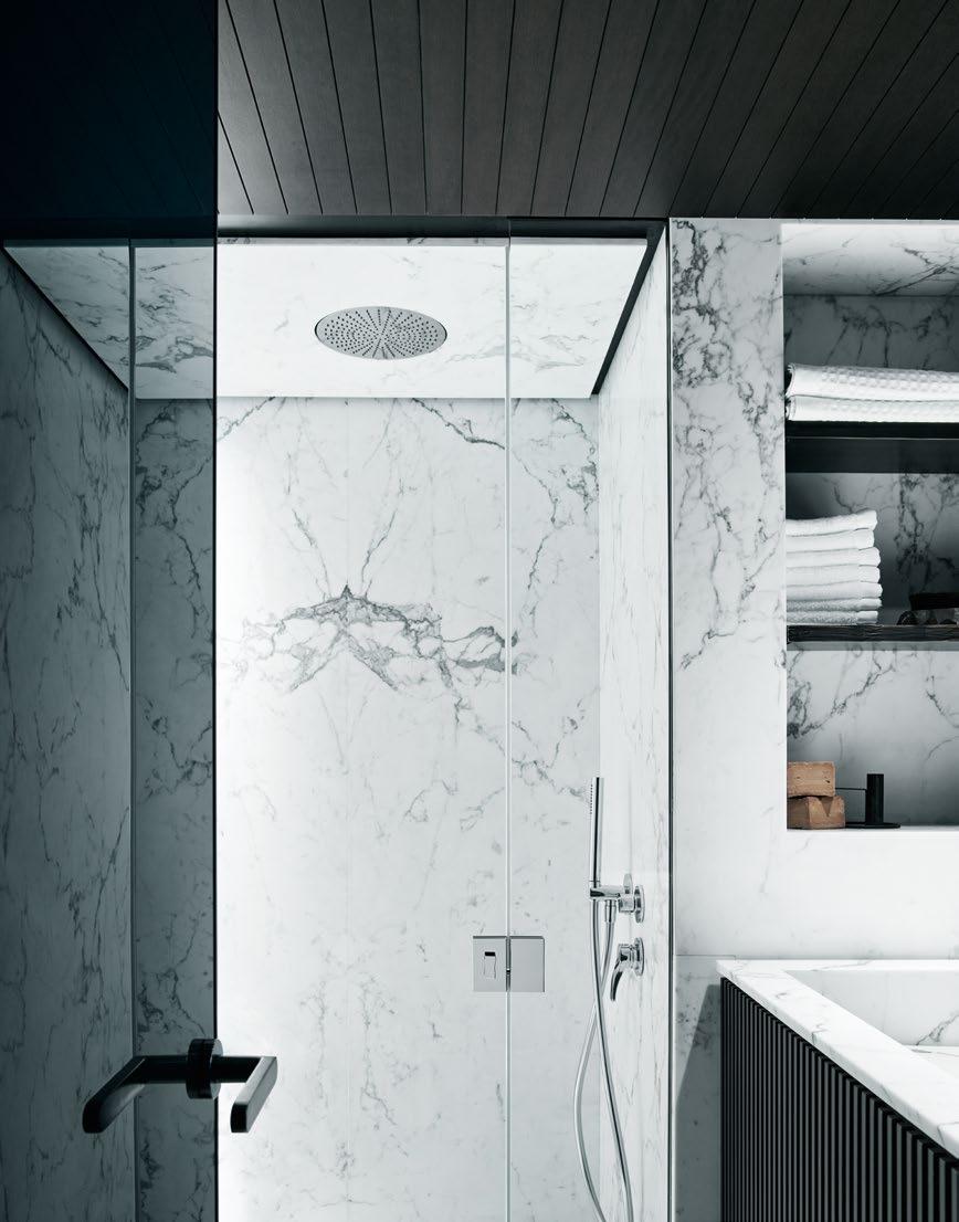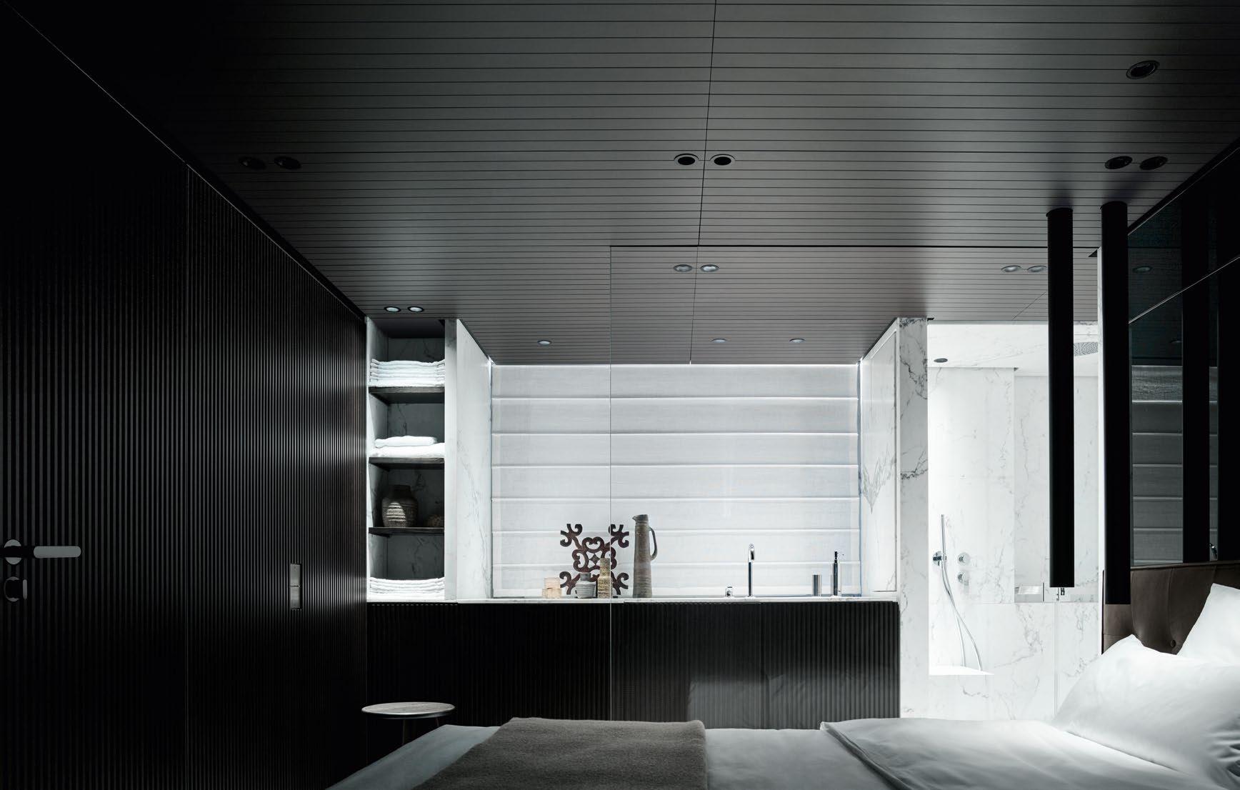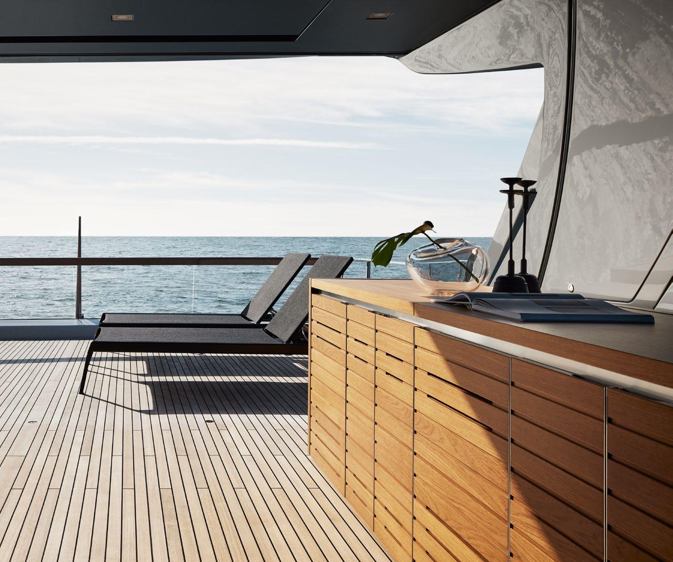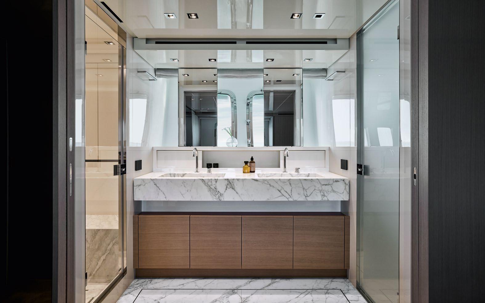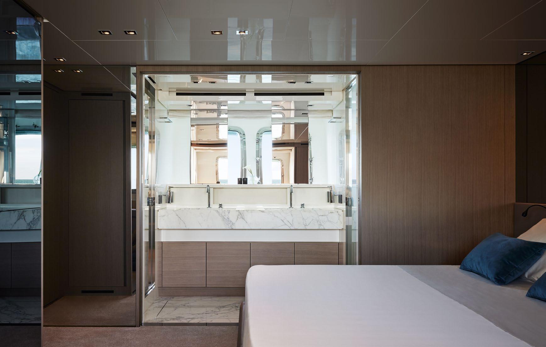 Even a quick glance at the windows of the SX88/02 reveals the fact that they are larger than what one might expect on a 27 meter yacht. As a result, they “bring” the panorama inside. This is just one sign of a special relationship with the sea, which also takes the form of outdoor zones of unprecedented proportions. The wheelhouse placed on the fly bridge frees up the main deck, so in this model with interior design by the architect Piero Lissoni the living area becomes a single loft-effect saloon, including the lounge, the totally open galley and another living zone at the bow. The atmosphere is one of sophisticated elegance, thanks to contemporary design furnishings, an island kitchen in stainless steel, floors in cement resin and grosgrain paneling in dark Tanganyika wood. The extraordinary craftsmanship of Sanlorenzo can be seen even in the smallest details (like the switches in brushed brass) and continues in the three cabins, which reprise the materials of the living area. The open bathrooms in Calacatta marble echo the details in grosgrain wood, the leitmotif of the entire yacht.