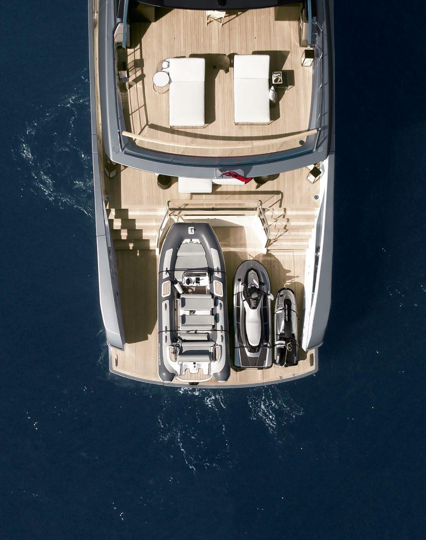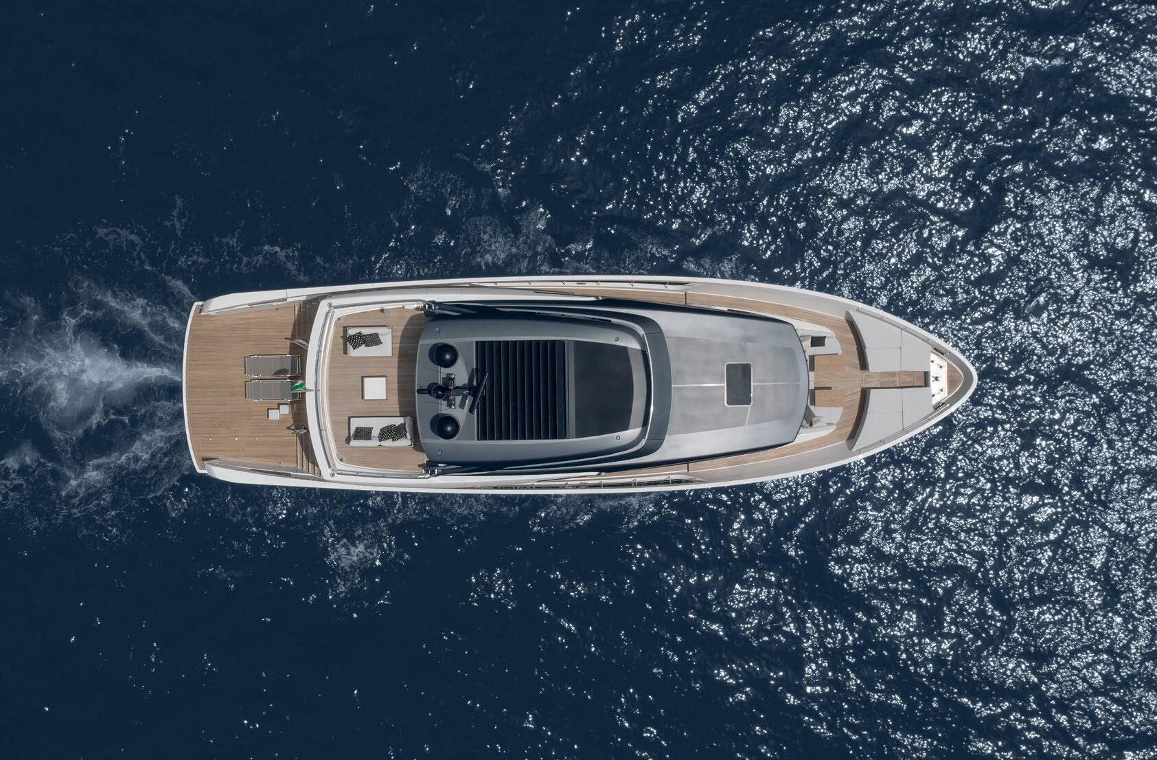 Observing the superstructure that reaches forward, and the beach area with the proportions of a large terrace, it becomes immediately clear that the SX line is a revolutionary project. Functions and uses of spaces intertwine, giving rise to a “crossover” yacht that is perfect for sophisticated contemporary owners. The main deck has been freed of the wheelhouse, which is instead placed on the flying bridge: the result is a continuous space to be used as a large, unified living area. Or, when separated at the bow, it can contain an exclusive owner’s cabin offering 360-degree views. The upper deck, which hosts the wheelhouse, has a dual function: protected towards the bow by a fixed windshield, thanks to a system of sliding panels it can become a closed, climate controlled panoramic lounge; kept open on the three sides towards the stern, it provides direct contact with the sea. The aft beach area is amazing: this space hosts tenders, water toys, and a davit to handle them; when they are removed, the area becomes a large beach club for relaxing right next to the water. The SX range includes 5 models, from 23 to 40 meters, with various interior layout possibilities, and can be completely personalized to suit the tastes and passions of the owner.