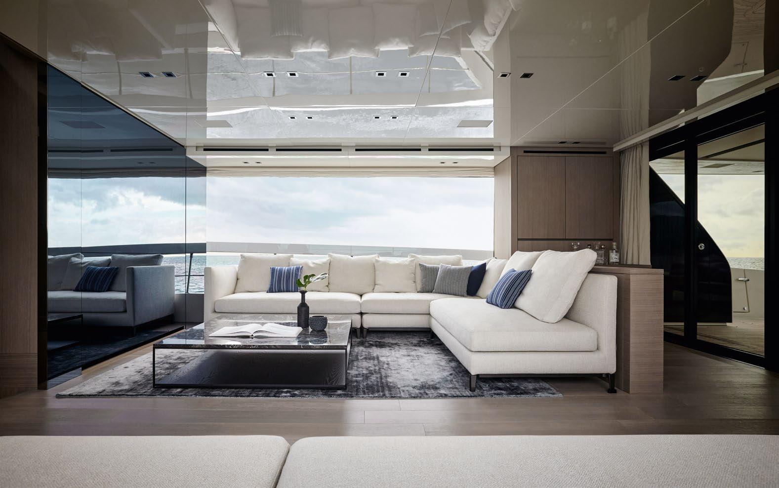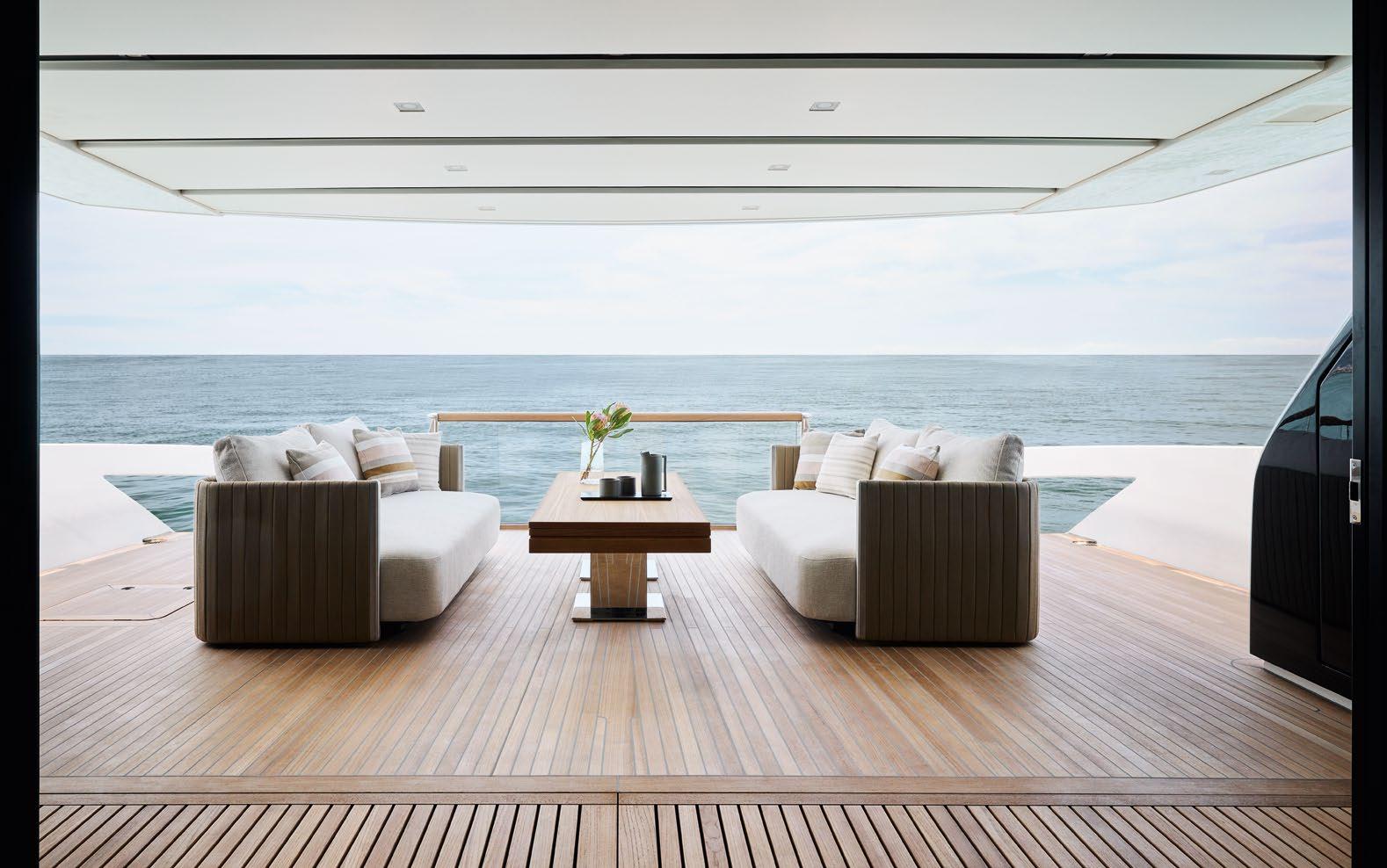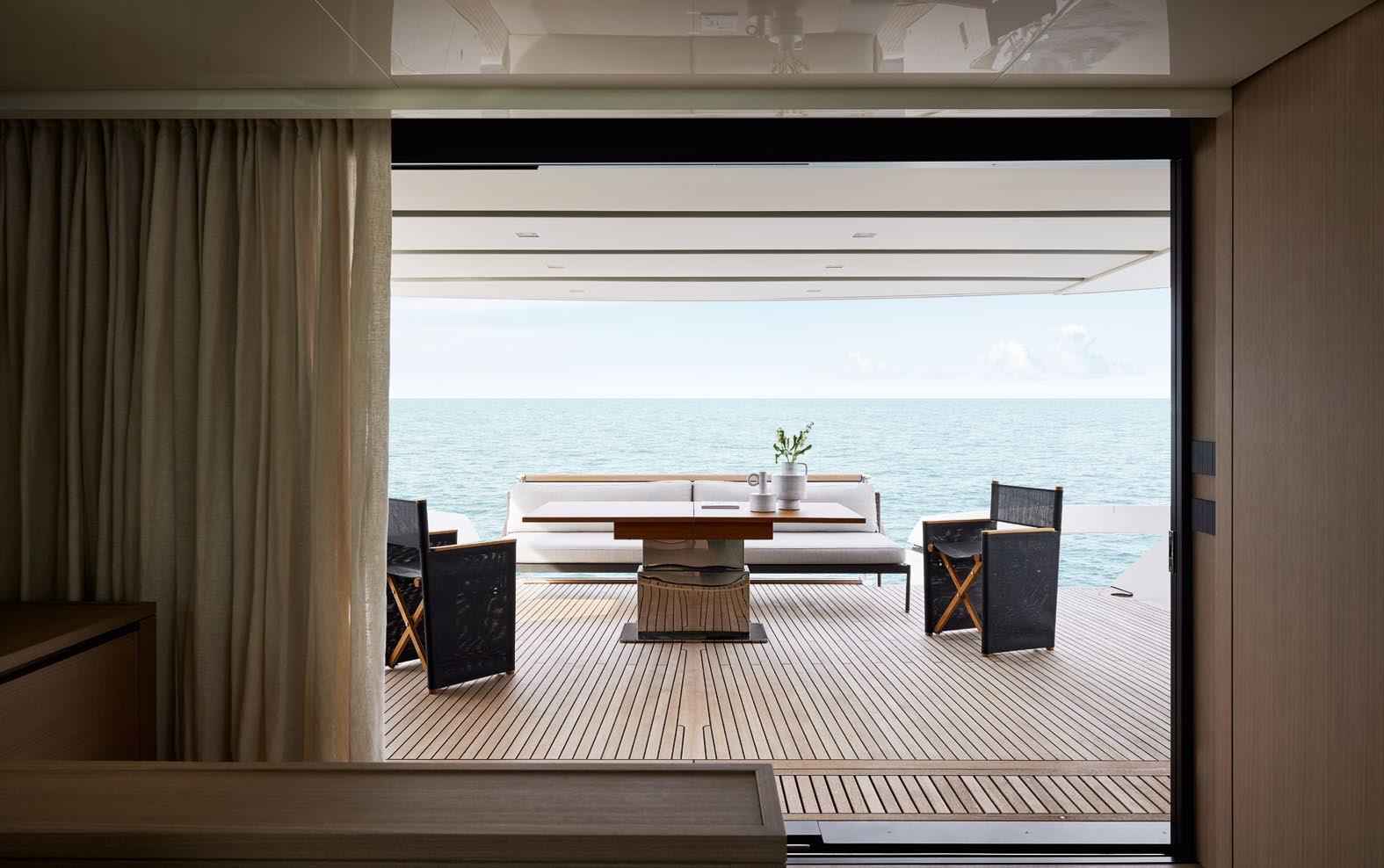 A refined simplicity prevails throughout the SX88-115 which, starting from the living area, extols the pleasure of just a few select furnishings, contemporary without being extreme, matching the light hues of the oak parquet and the lacquered clerestory window. The only pop is the dark blue chosen for the hand-made carpet, the decorative cushions, and the seats in the dining areas, located forward and furnished with a Calacatta marble table. The kitchen creates a separation between the living and dining areas which, by virtue of the wheelhouse located on the upper deck, extend over the entire deck. The owner’s cabin, centrally located and extending full-width, has a bathroom in walnut and Calacatta marble nestled next to the room with sliding doors, which offer an effect of great spaciousness and light. The exterior areas are plentiful and versatile: the transformable aspect of lunch and recreation area returns as a motif in the cockpit and at the bow as well. But the chief value of the exteriors is the generous stern beach area, where you can laze and lounge at the water’s edge or slip directly into the sea.