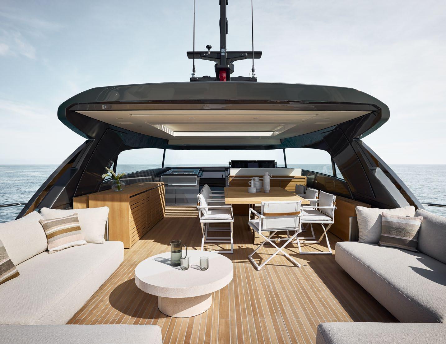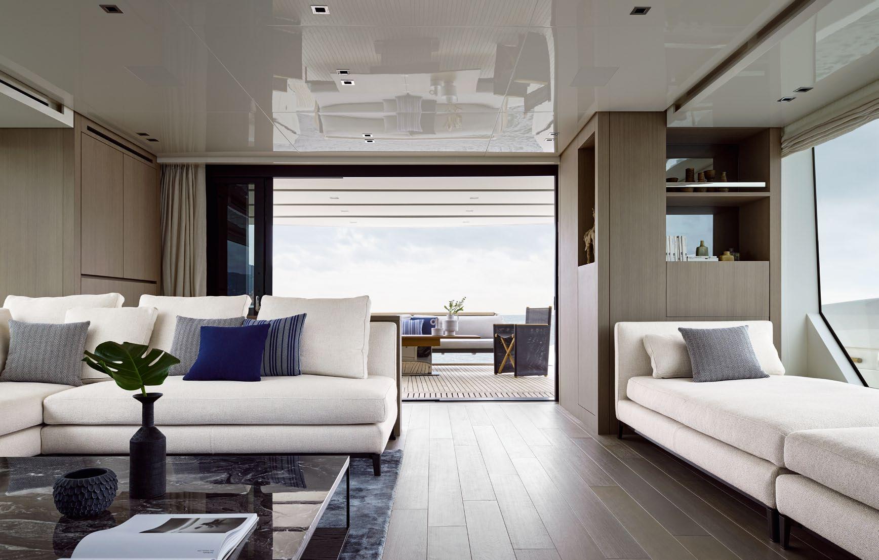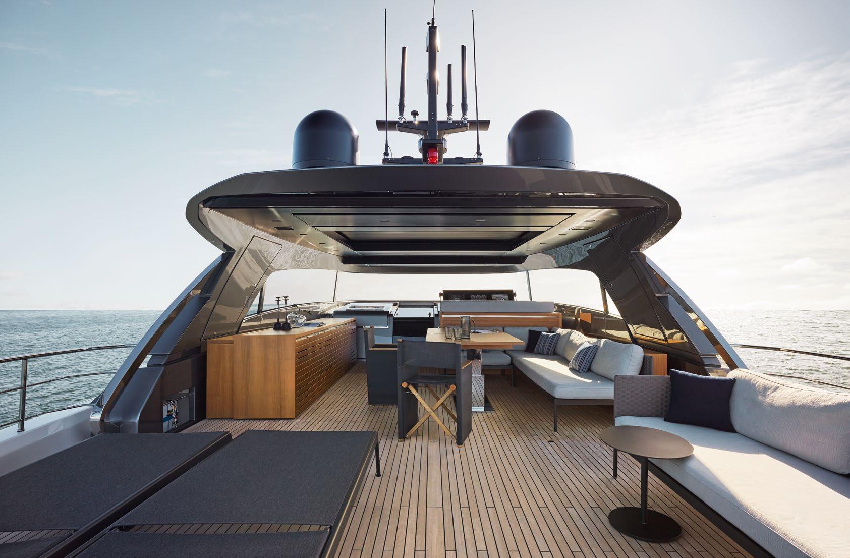 A refined simplicity prevails throughout the SX88-115 which, starting from the living area, extols the pleasure of just a few select furnishings, contemporary without being extreme, matching the light hues of the oak parquet and the lacquered clerestory window. The only pop is the dark blue chosen for the hand-made carpet, the decorative cushions, and the seats in the dining areas, located forward and furnished with a Calacatta marble table. The kitchen creates a separation between the living and dining areas which, by virtue of the wheelhouse located on the upper deck, extend over the entire deck. The owner’s cabin, centrally located and extending full-width, has a bathroom in walnut and Calacatta marble nestled next to the room with sliding doors, which offer an effect of great spaciousness and light. The exterior areas are plentiful and versatile: the transformable aspect of lunch and recreation area returns as a motif in the cockpit and at the bow as well. But the chief value of the exteriors is the generous stern beach area, where you can laze and lounge at the water’s edge or slip directly into the sea.