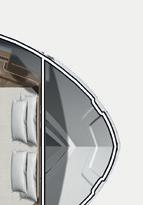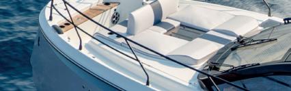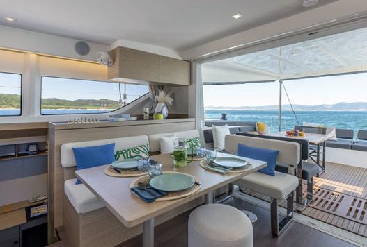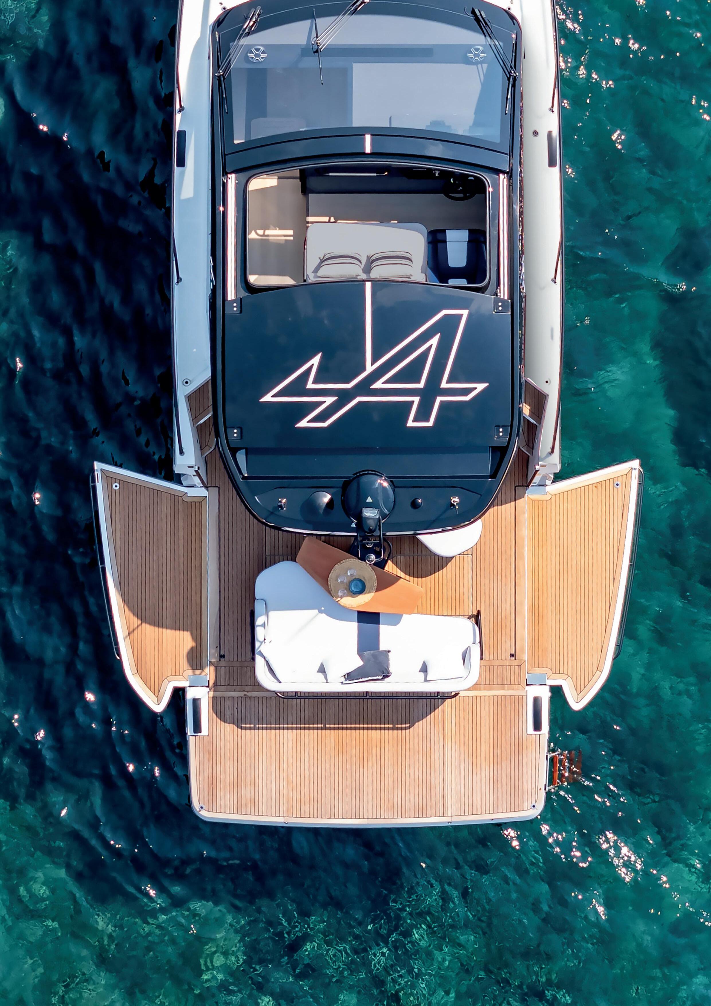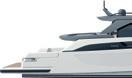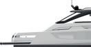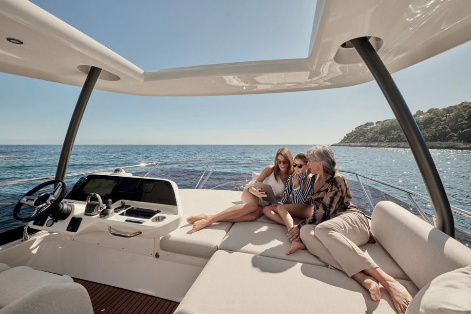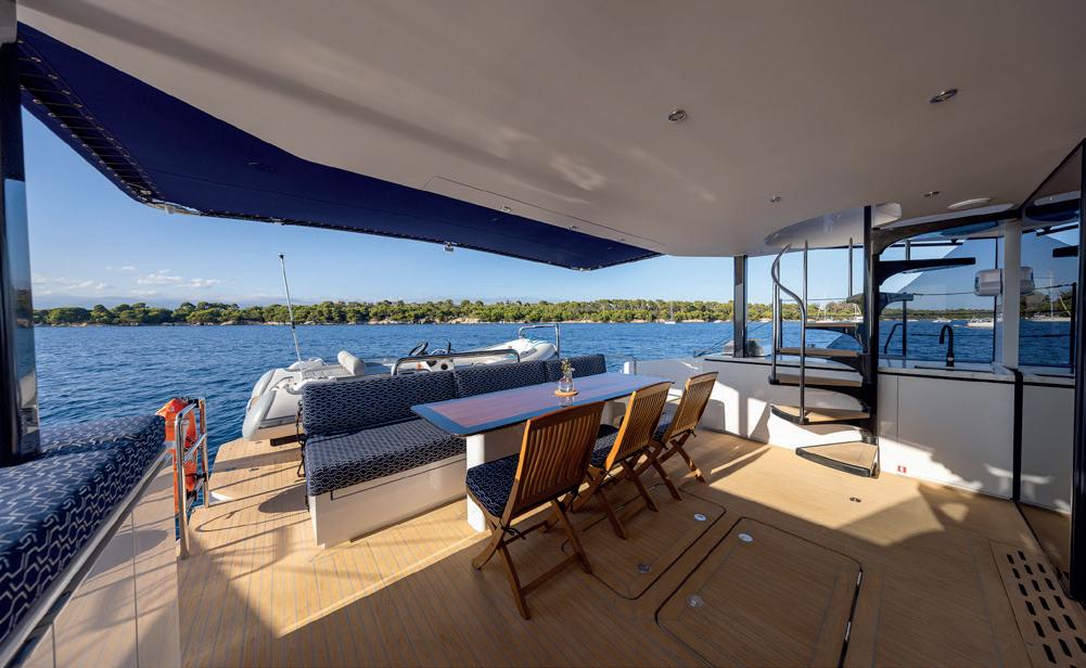 Its expansive stern area and 360° cockpit create a dramatic open-air living space with uninterrupted views, while the surrounding seating and extendable table make it ideal for relaxed entertaining.