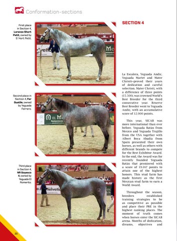 La Escalera, Yeguada Andic, Yeguada Martet and Mater Christi--proved their years of dedication and careful selection. Mater Christi, with a difference of three points (15.500), was crowned World’s Best Breeder for the third consecutive year. Reserve Best Breeder went to Yeguada Andic, with an accumulative score of 12.000 points. This year, SICAB was more international than ever before. Yeguada Batán from Mexico and Yeguada Trujillo from the USA together with Albert Boya Abadía from Spain presented their own horses, as well as others with different brands to compete for the Best Exhibitor Award. In the end, the Award was for recently founded Yeguada Batán that premiered with a score of 19.167 points to attain one of the highest honors. This stud farm has made history as the first Mexican stud farm to earn a World Award. Throughout the season, breeders established training strategies to be as competitive as possible and place their PRE in the highest ranking places. The moment of truth comes when horses enter the SICAB arena. Months of dedication, dreams, objectives and