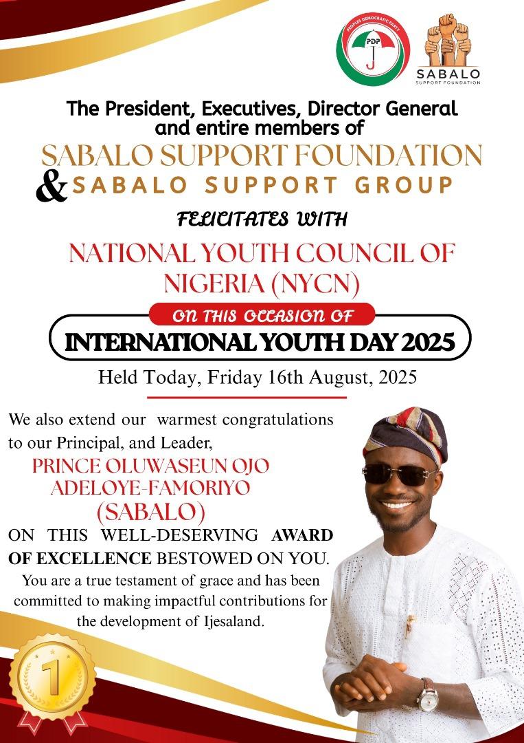 It is with great joy and heartfelt admiration that I, Adeniyi Segun Moses, humbly writing on behalf of Ambassador Dr. Olatunji Oluwadamilare, CEO of Leovest Reassuring Hands Foundation, extend our warmest congratulations on your award of excellence bestowed on you by the NationalYouthCouncilofNigeria(NYCN),OsunStateChapter.