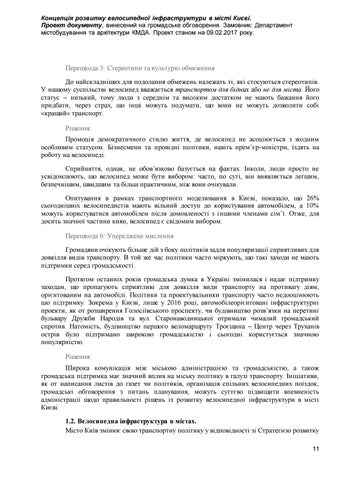 Перешкода 5: Стереотипи та культурні обмеження До найскладніших для подолання обмежень належать ті, які стосуються стереотипів. У нашому суспільстві велосипед вважається транспортом для бідних або не для міста. Його статус – низький, тому люди з середнім та високим достатком не мають бажання його придбати, через страх, що інші можуть подумати, що вони не можуть дозволити собі «кращий» транспорт. Рішення: Промоція демократичного стилю життя, де велосипед не асоціюється з жодним особливим статусом. Бізнесмени та провідні політики, навіть прем’єр-міністри, їздять на роботу на велосипеді. Сприйняття, однак, не обов’язково базується на фактах. Інколи, люди просто не усвідомлюють, що велосипед може бути вибором: часто, по суті, він виявляється легшим, безпечнішим, швидшим та більш практичним, ніж вони очікували. Опитування в рамках транспортного моделювання в Києві, показало, що 26% сьогоднішніх велосипедистів мають вільний доступ до користування автомобілем, а 10% можуть користуватися автомобілем після домовленості з іншими членами сім’ї. Отже, для досить значної частини киян, велосипед є свідомим вибором. Перешкода 6: Упереджене мислення Громадяни очікують більше дій з боку політиків задля популяризації сприятливих для довкілля видів транспорту. В той же час політики часто міркують, що такі заходи не мають підтримки серед громадськості. Протягом останніх років громадська думка в Україні змінилася і надає підтримку заходам, що пропагують сприятливі для довкілля види транспорту на противагу діям, орієнтованим на автомобілі. Політики та проектувальники транспорту часто недооцінюють цю підтримку. Зокрема у Києві, лише у 2016 році, автомобілеорієнтовані інфраструктурні проекти, як от розширення Голосіївського проспекту, чи будівництво розв’язки на перетині бульвару Дружби Народів та вул. Старонаводницької отримали чималий громадський спротив. Натомість, будівництво першого веломаршруту Троєщина – Центр через Труханів острів було підтримано широкою громадськістю і сьогодні користується значною популярністю. Рішення: Широка комунікація між міською адміністрацією та громадськістю, а також громадська підтримка має значний вплив на міську політику в галузі транспорту. Ініціативи, як от написання листів до газет чи політиків, організація спільних велосипедних поїздок, громадські обговорення з питань планування, можуть суттєво підвищити впевненість адміністрації щодо правильності рішень із розвитку велосипедної інфраструктури в місті Києві. 1.2. Велосипедна інфраструктура в містах. Місто Київ змінює свою транспортну політику у відповідності зі Стратегією розвитку 11